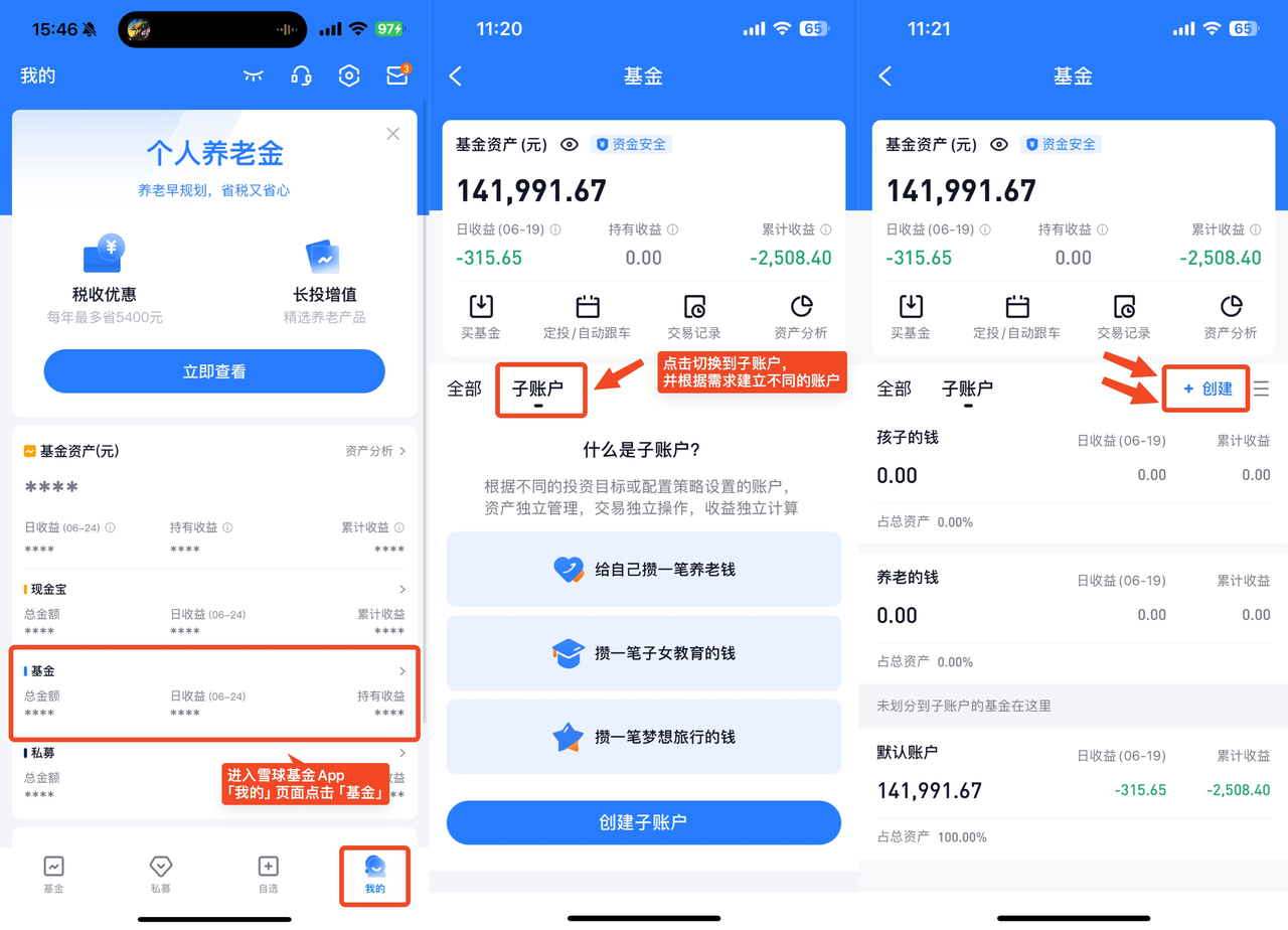1. 打开雪球基金 App,点击底栏「我的」,点击「基金」后可以看到「子账户」页面,在这里点击「创建」即可。