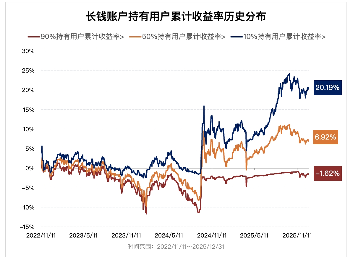 在 2025 年度运作报告的最后,有这样一张图(图二),展示的是自 2022 年 11 月以来,长钱账户持有用户的累计收益率变化和分布情况。