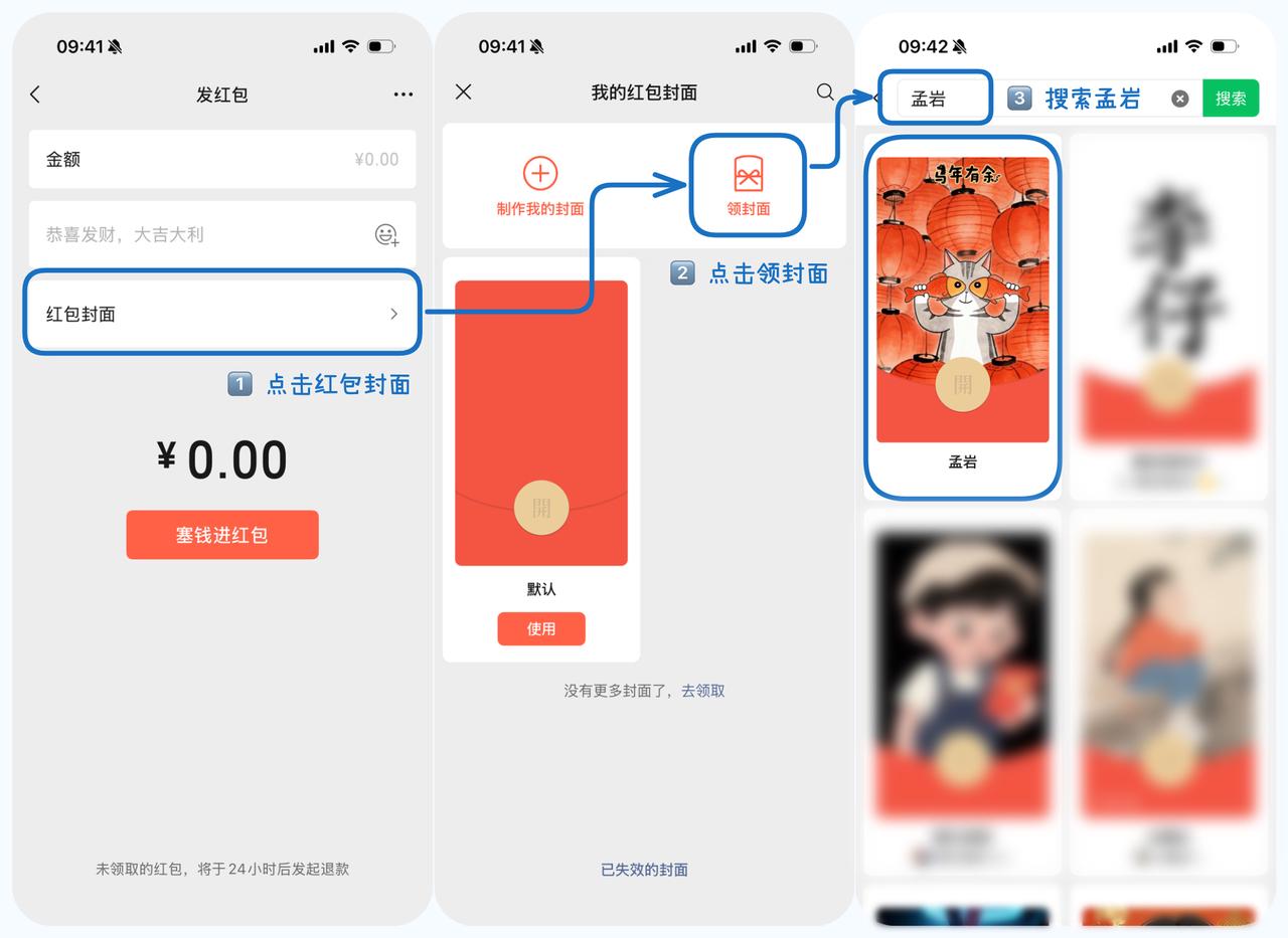 我们为大家准备了一些新年红包封面,在微信中打开任一聊天对话,点击「发红包 > 红包封面 > 领封面」后,搜索「孟岩」就可以领取啦。