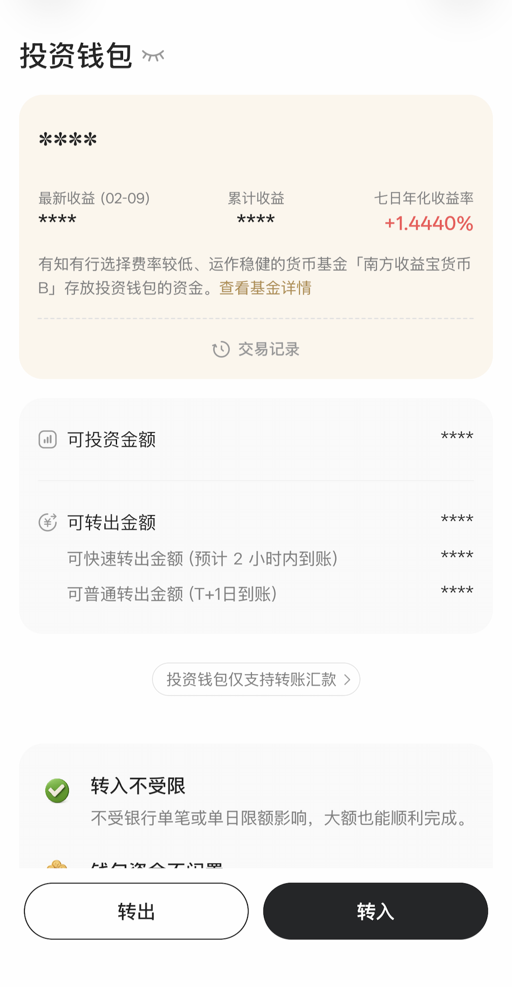 在有知有行 App 里,你将资金从银行卡转入投资钱包后,不需要额外操作,系统会自动申购南方收益宝B这只货币基金。