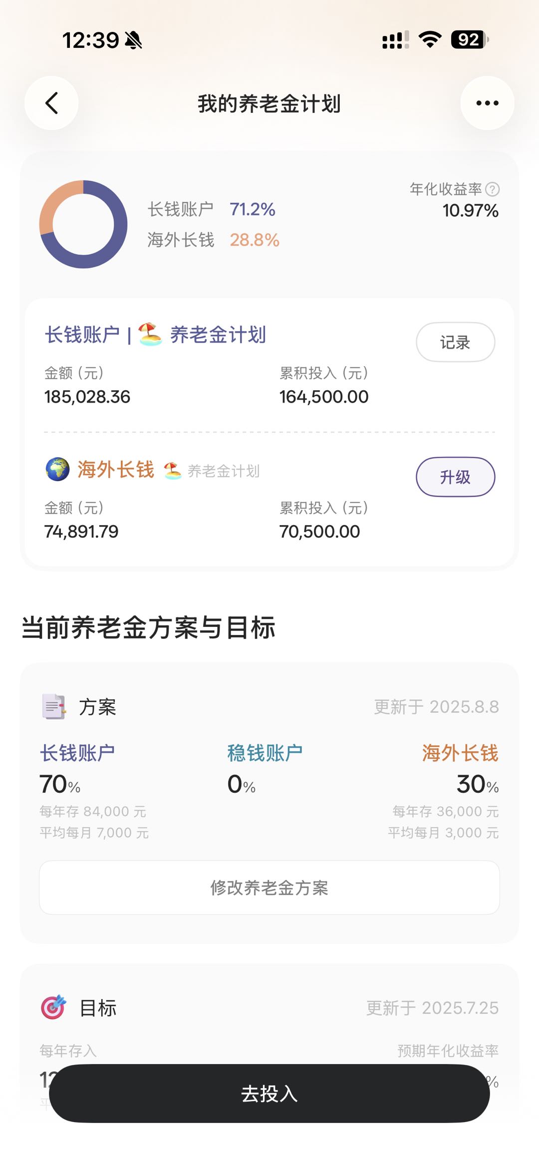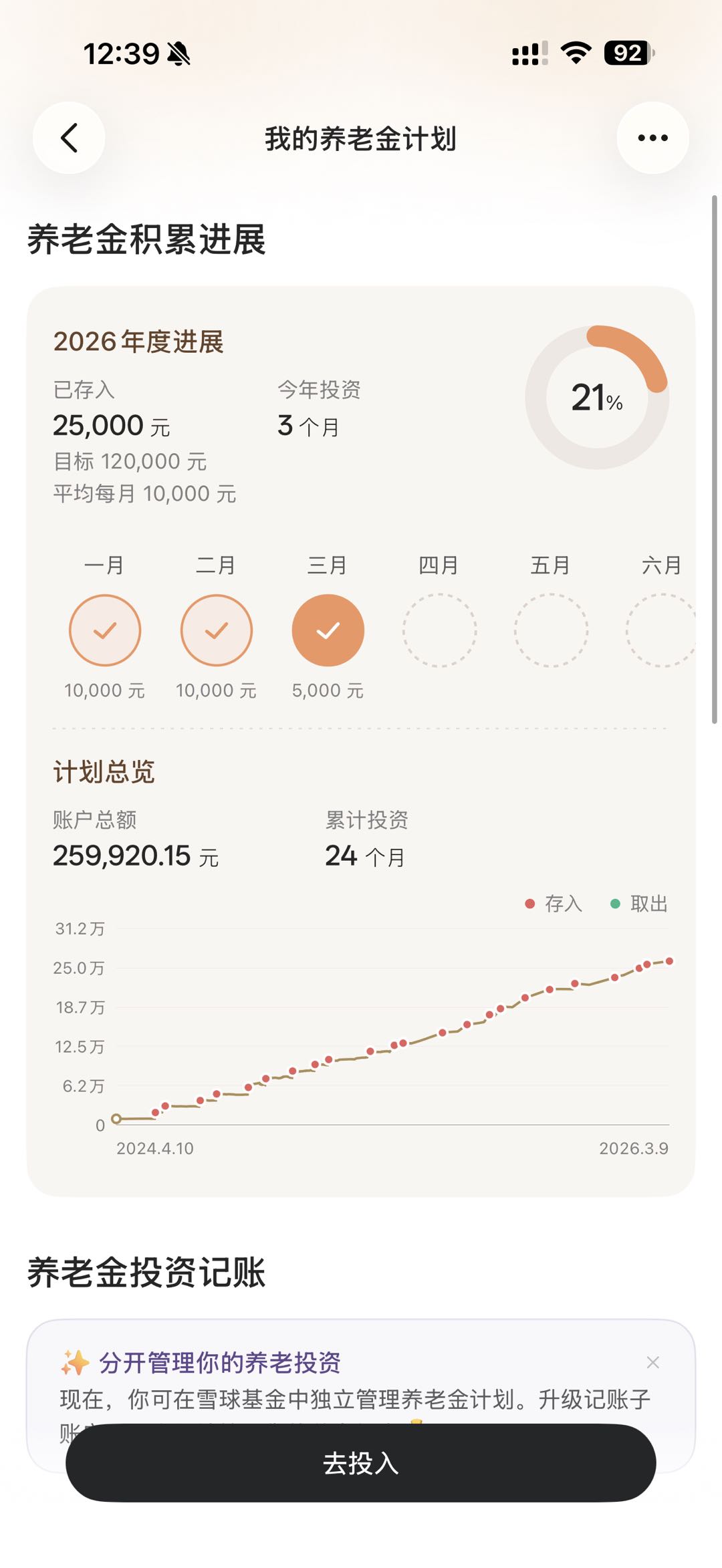 养老金计划(每月 7000 长钱,3000 海外长钱;因为海外长钱限额,分成两天买,每天各买 5000)目前共投入 24 个月。