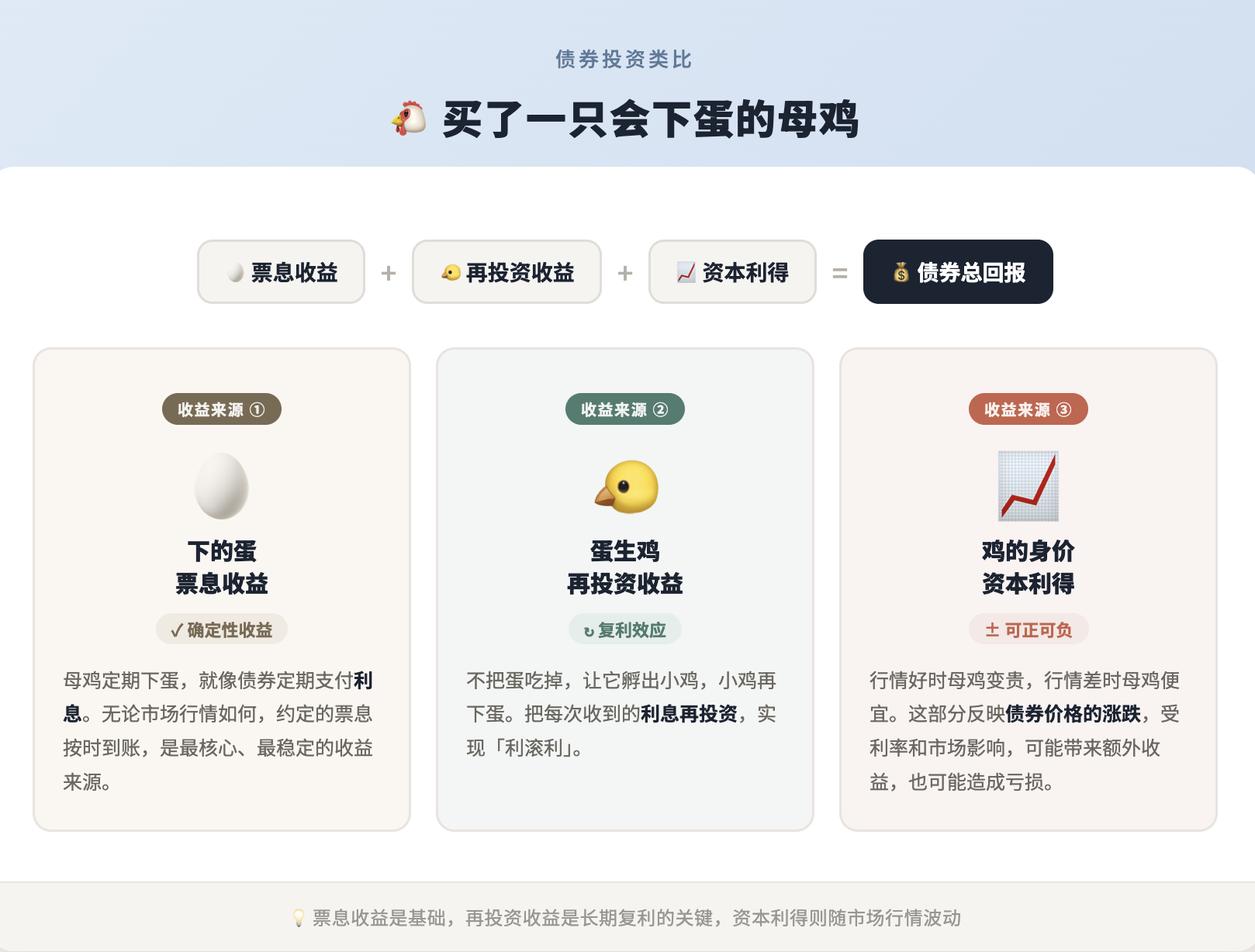 我们可以把买债券,想象成买了一只「会下蛋的母鸡」,它的收益通常来自三个部分: