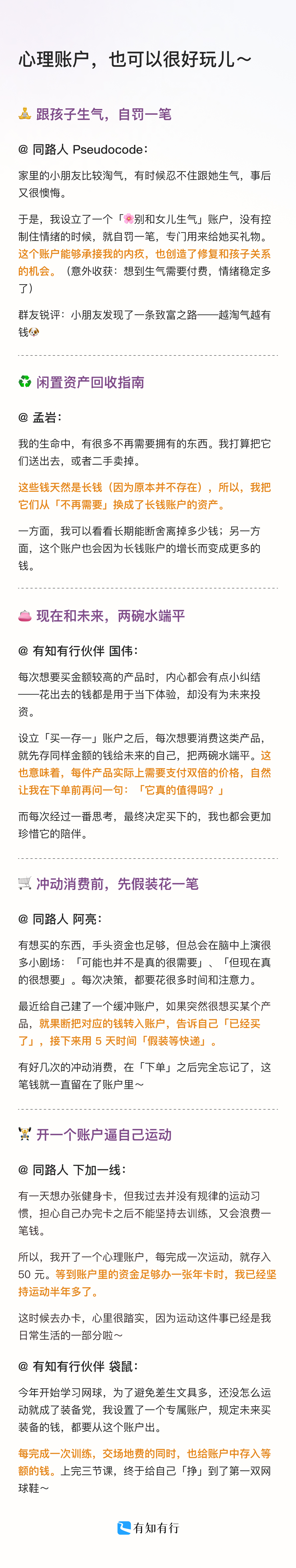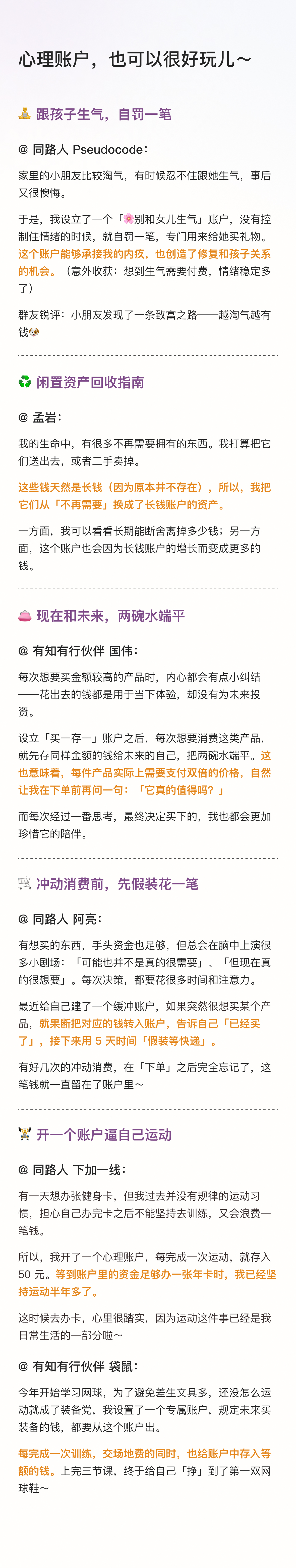 下面是一些同路人的实践,也欢迎大家来评论区聊聊:你都有哪些好玩的心理账户?或者打算开启什么样的游戏?
