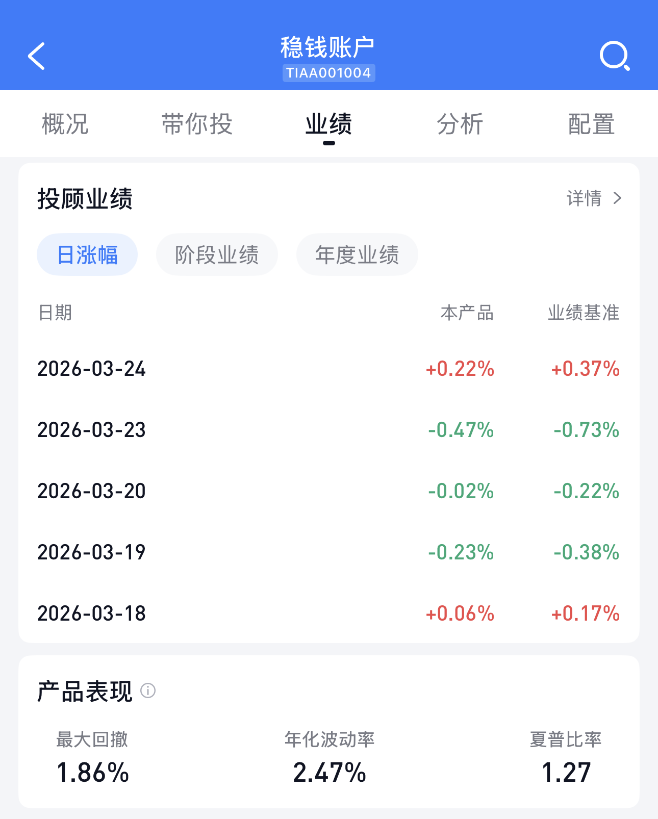 在A股这样两个波动剧烈的交易日里,稳钱账户的表现怎么样呢?以稳钱账户示例账户为例,我们看到 3 月 23 日,它下跌了 -0.47%;3 月 24 日,则反弹上涨了 0.22%。