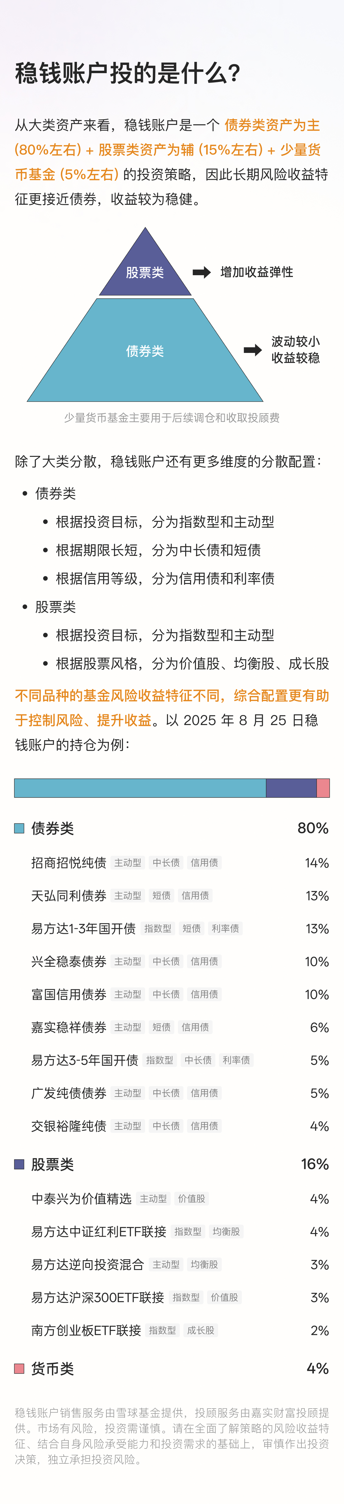 在稳钱账户的组合内,约配置了 80% 的债券类资产,加上 15% 的股票类资产。通过股债分散配置的方式,就像跷跷板的两头,稳钱账户可以度过市场的不同阶段: