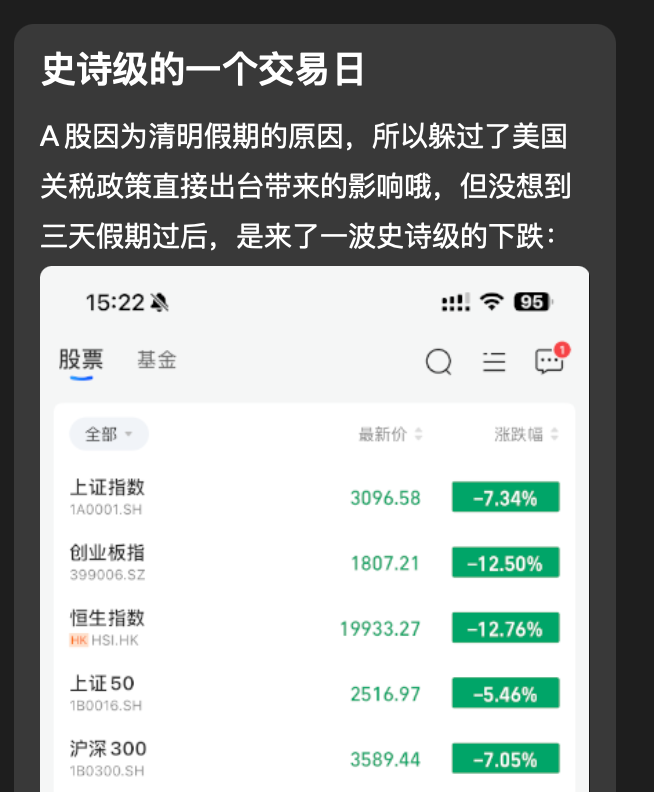 对我来说,印象最深刻的,那肯定是周一的下跌了。当时自己第一时间联想到的,就是去年 4 月 7 日的下跌。因为有写日记的习惯,所以还翻出来了当时的记录(可见图一)。