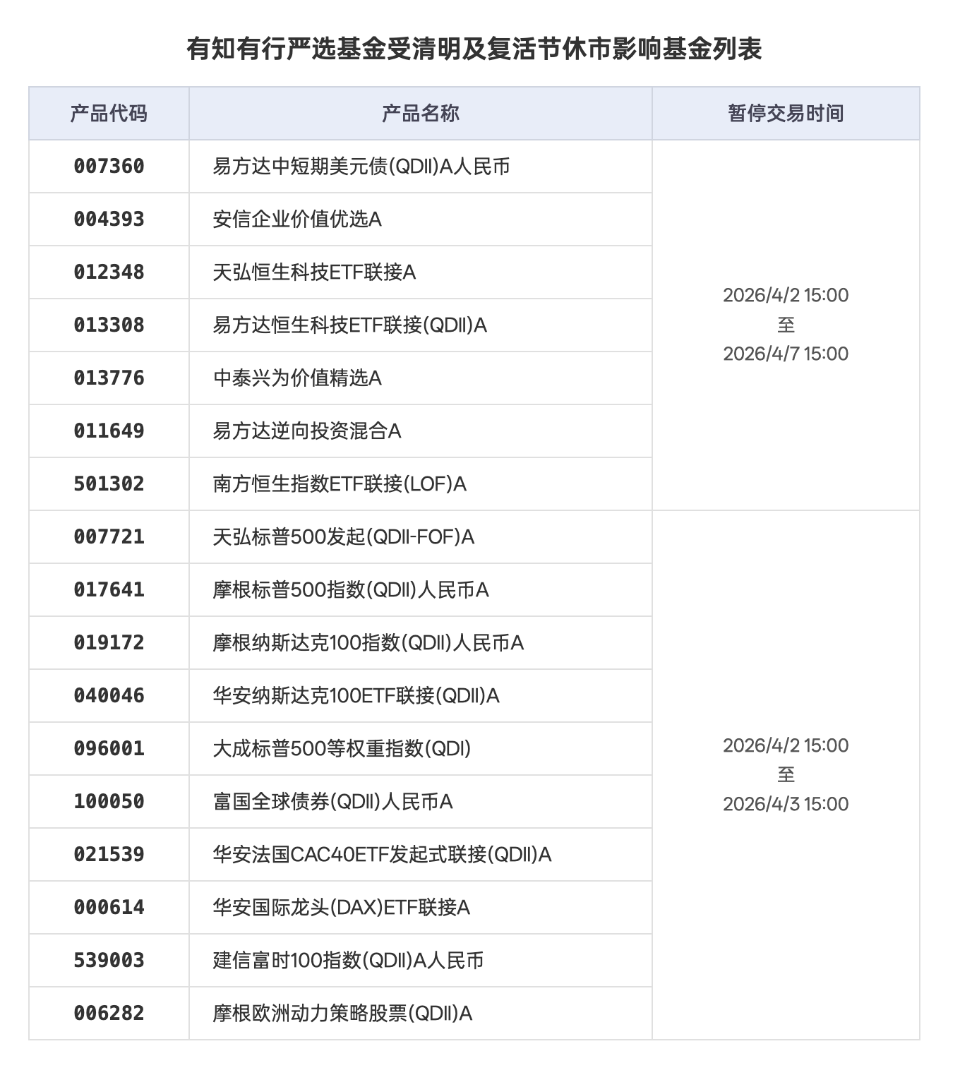 有知有行基金严选中,有 17 只基金受到假期休市影响。我们整理了相关的表格,可见下方示意图。