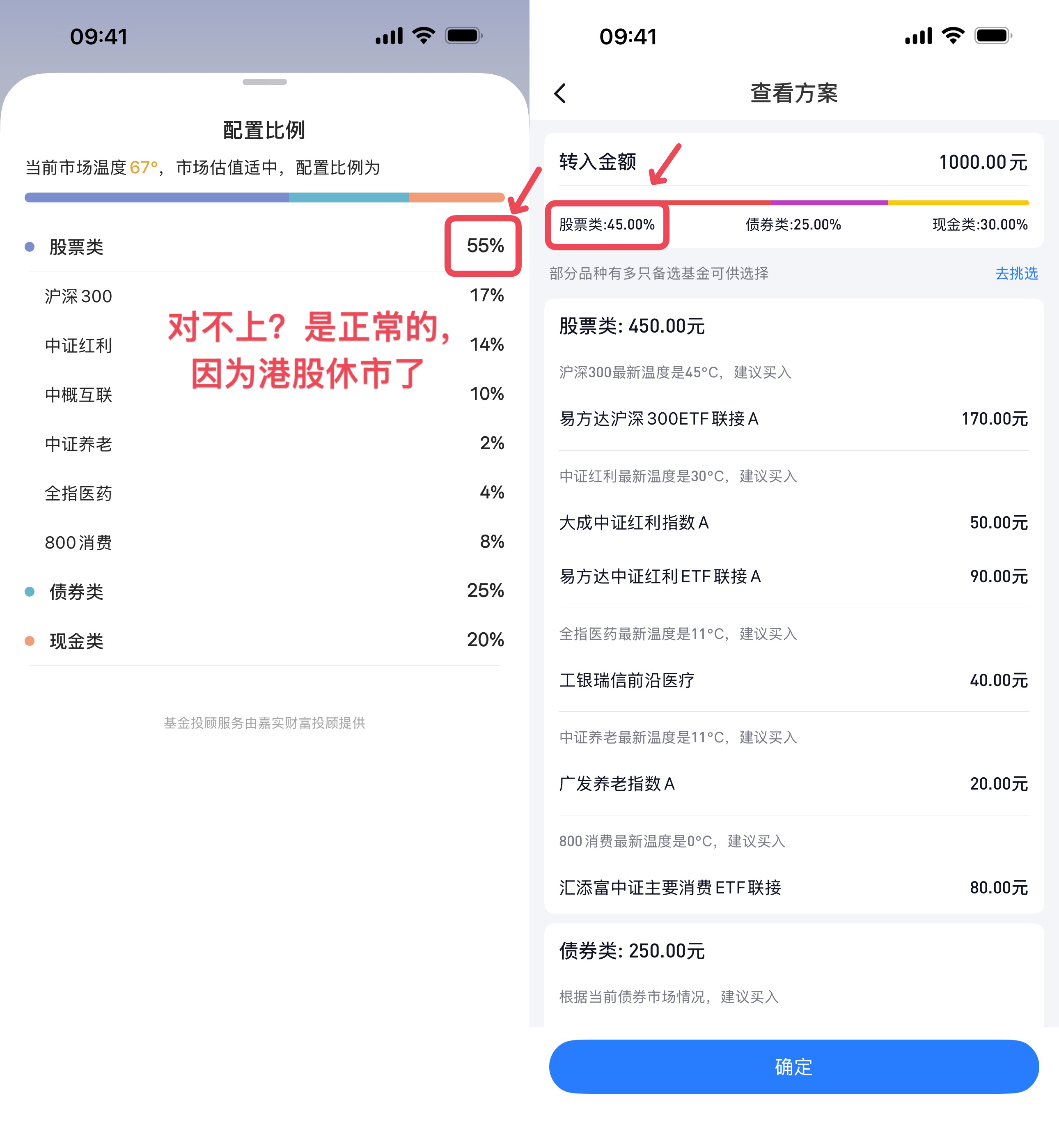 如果你在这期间投入长钱账户,可能会发现有知有行 App 里显示的股票型基金比例,和去往雪球基金实际看到的投入比例有差距——比如目标是 55%,实际显示只有 45%。这是正常的,就是因为暂停申购导致的。