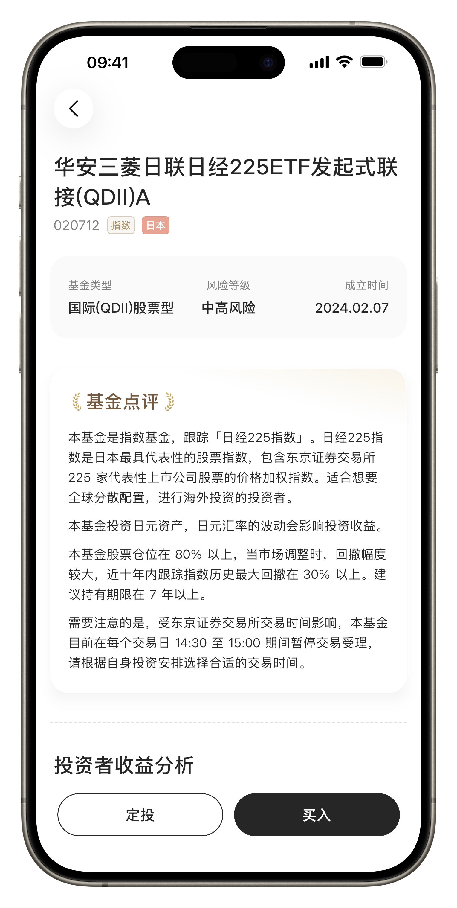 在有知有行 App 的严选基金里,近期有上新:华安三菱日联日经225ETF发起式联接(QDII)A,基金代码 020712。