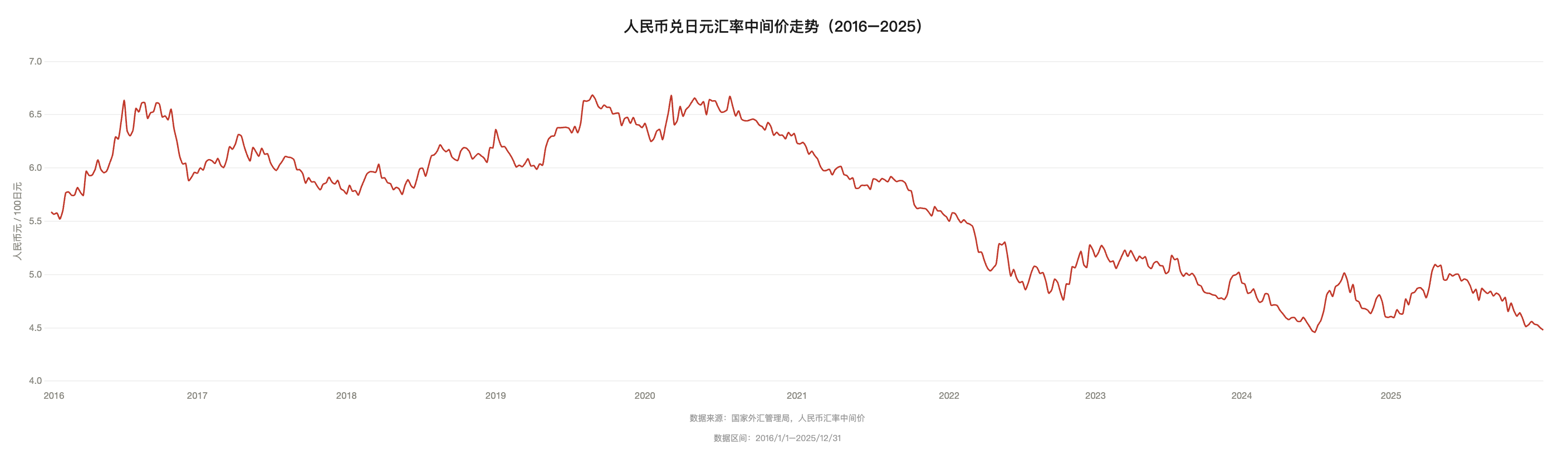 · 汇率影响。这个因素更为关键,因为基金投资的是日元资产,而近十年,日元相对人民币整体都是在贬值。(可见图二)因此即使日股自身在上涨,汇率贬值会「吃掉」一大部分你用人民币计价时看到的收益。