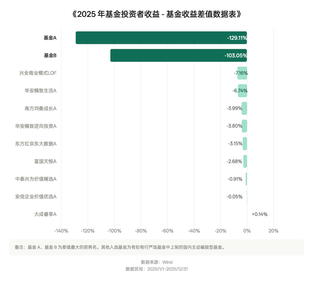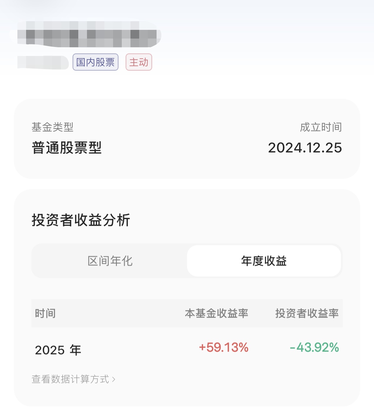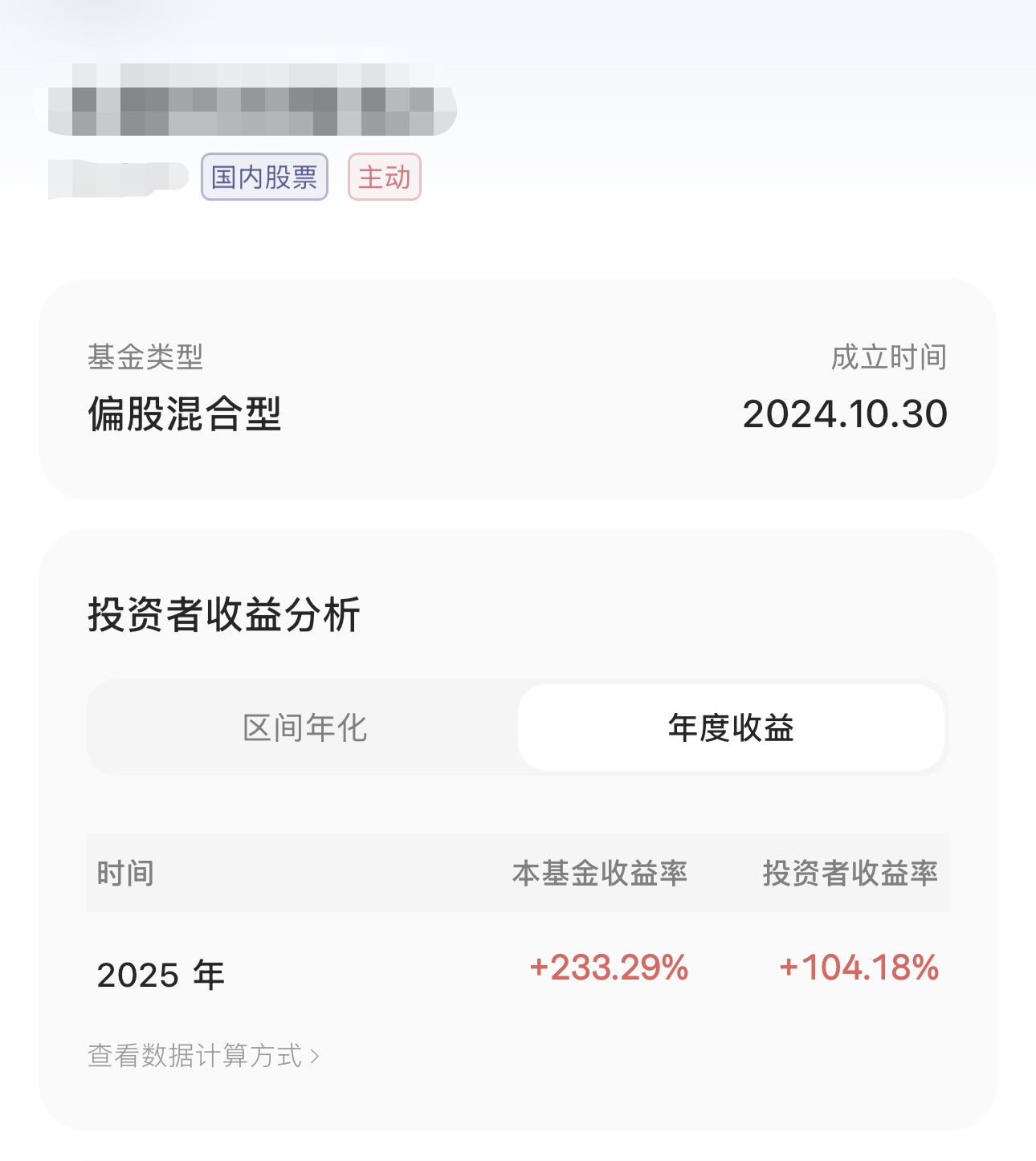 先来看看图一,这是 2025 年全市场里主动偏股型基金的收益率冠军。基金 A 的全年收益率 233.29%,竟恐怖如斯。但对应的投资者收益率,是 104.18%。