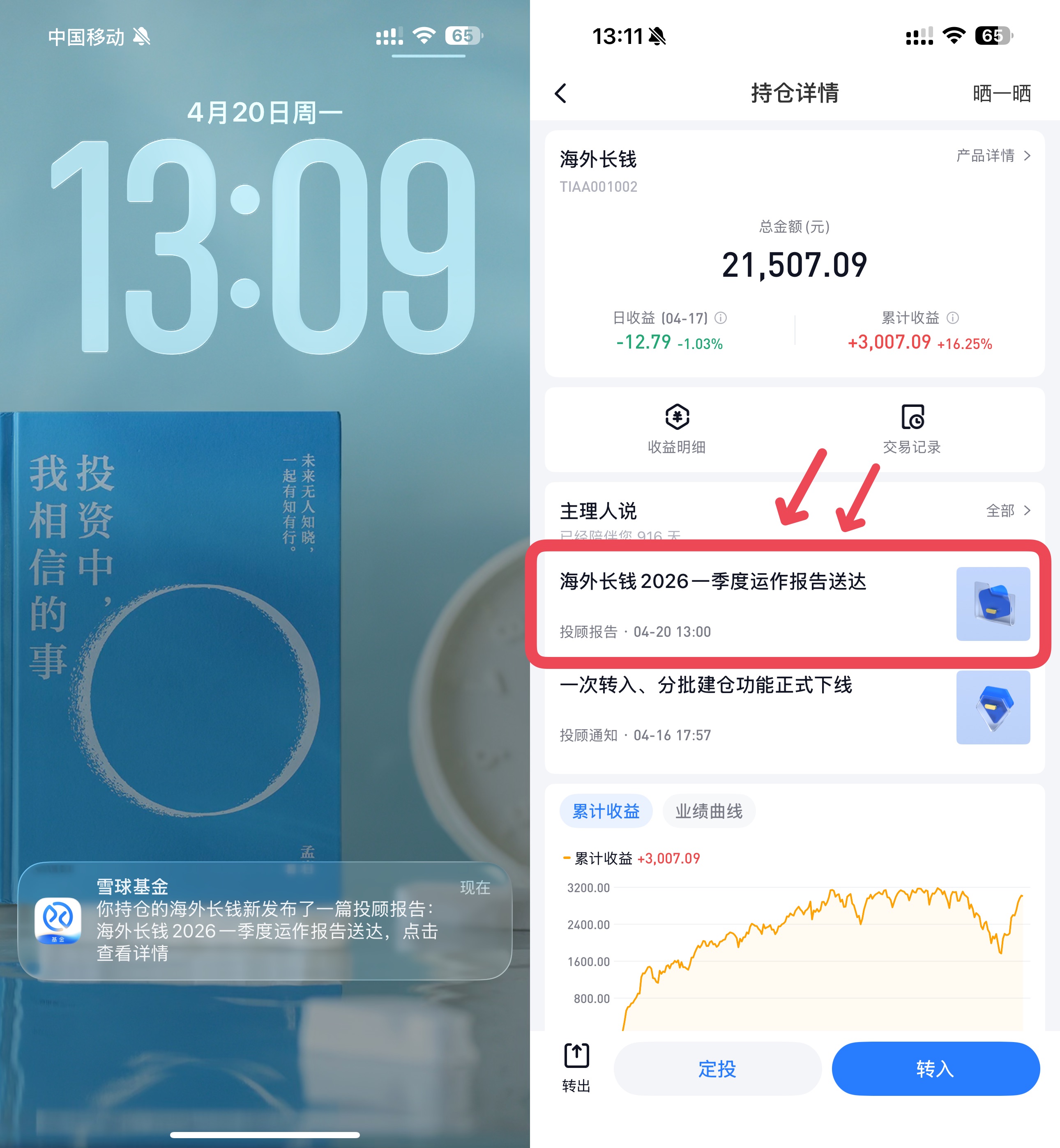 长稳海三个投顾组合,已通过雪球基金 App 向你推送 2026 年一季度运作报告。你可以按照示意图的路径,找到报告全文进行查看。
