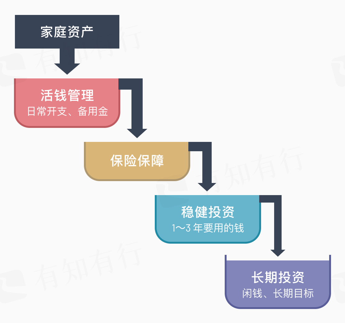 先用活钱、保险和备用金,保障生活的底线不被击穿,再慢慢往下,去考虑未来可能的刚性支出和更长期的资产增值。水会先蓄满第一个水池,之后再溢出到下一个水池。用这个顺序去梳理家庭财务,会更有条理一些。