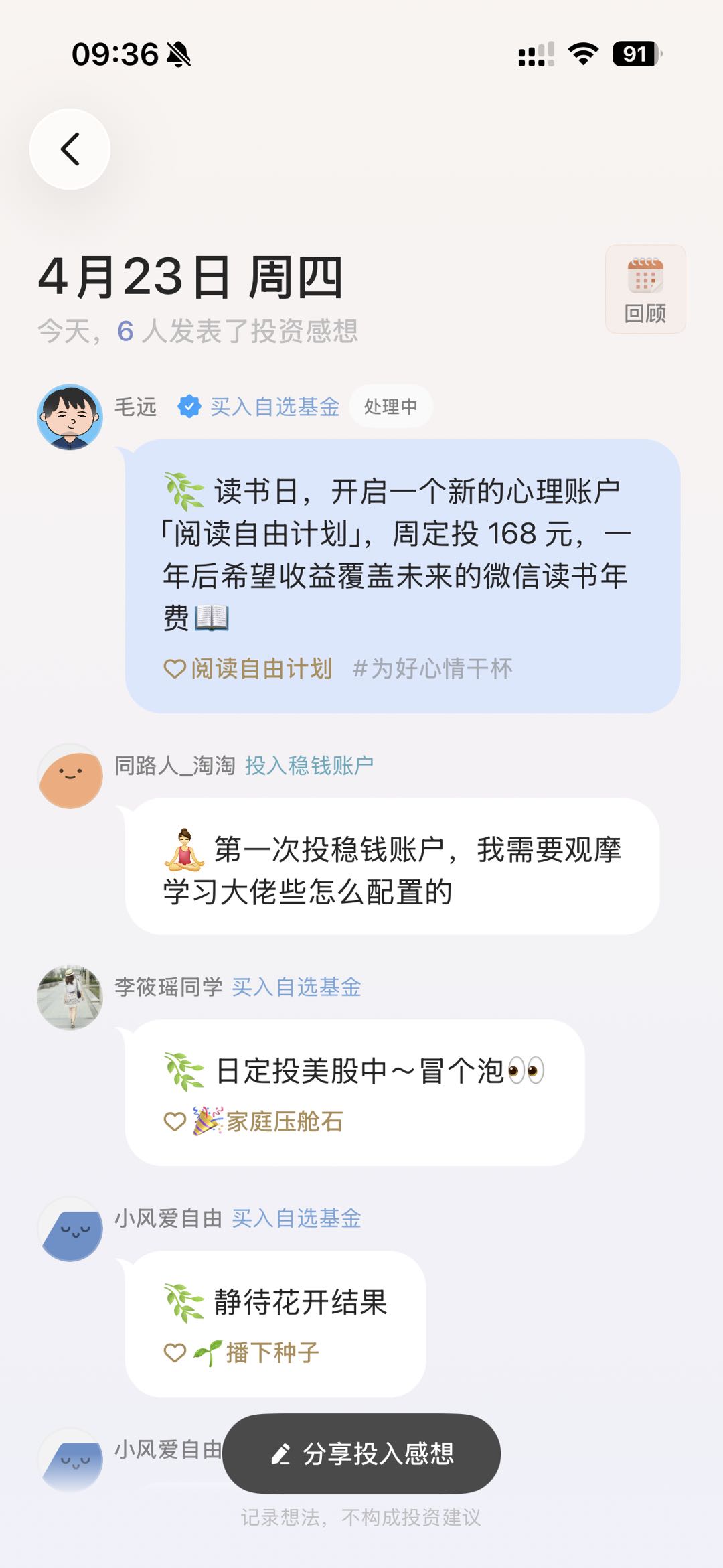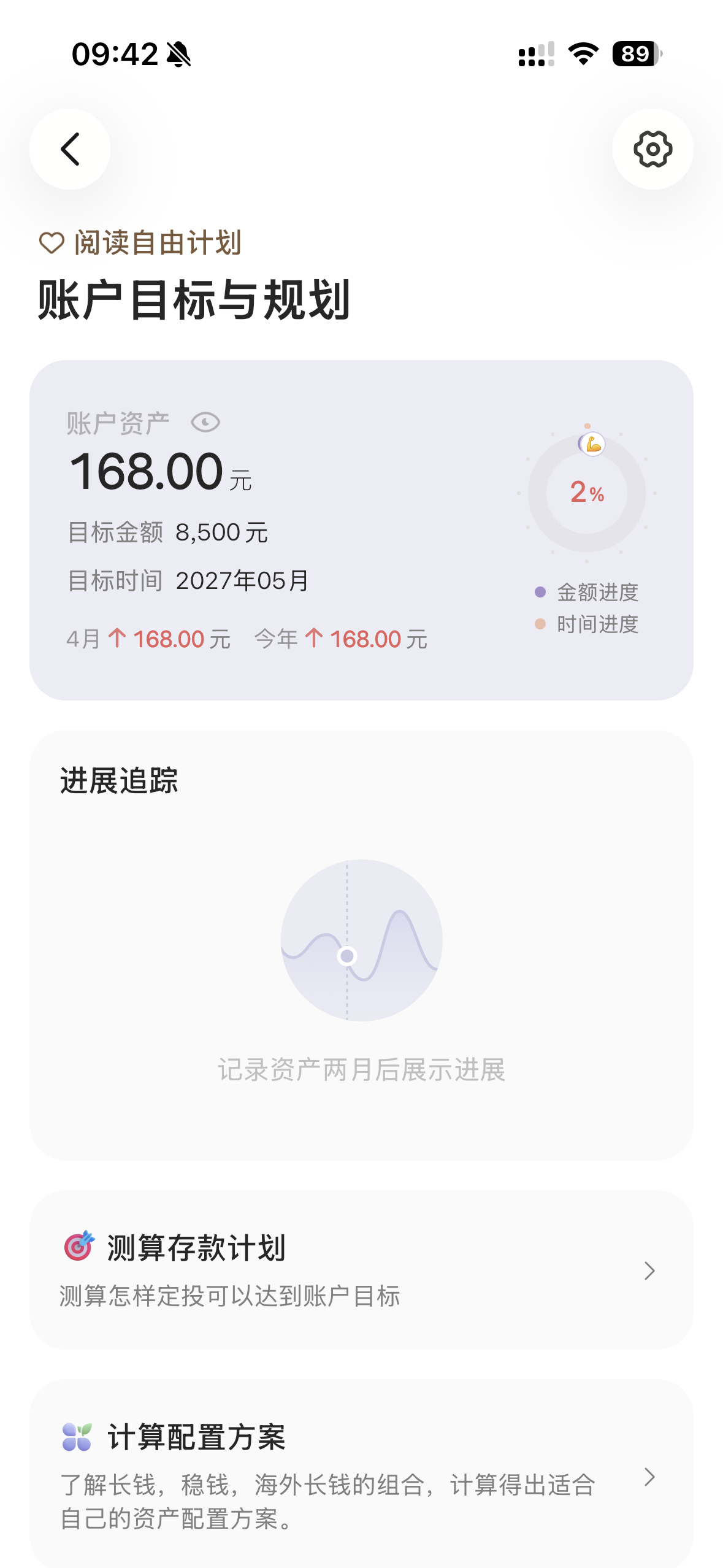 如果暂时没有这么一笔,也可以换一种方式:为自己建一个叫「阅读自由计划」的心理账户,再设置周定投,每周也是刚好买入 168 元,一年下来,差不多就能存够需要的本金了。