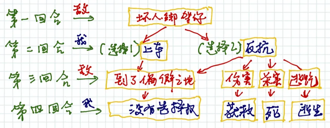 如果「你」乖乖上了绑匪的车,如上图左分支(选择 1)所示,可能导致如下结果:
