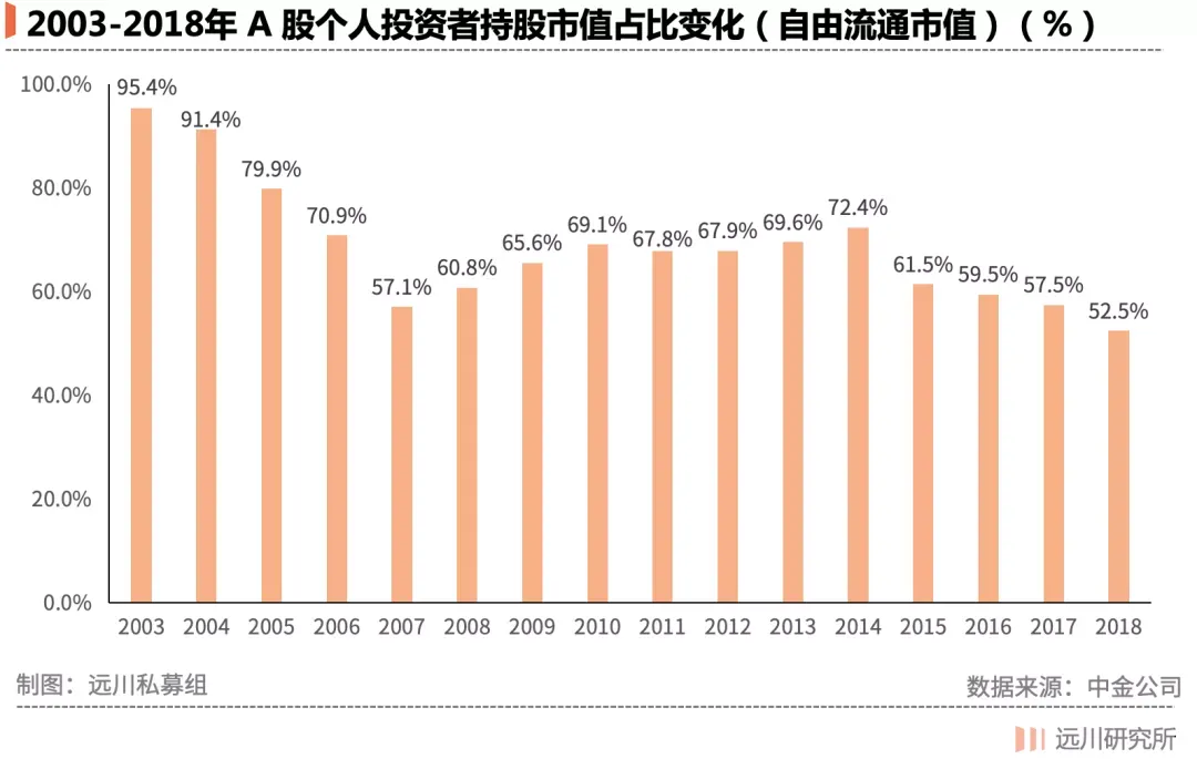 高频机器的凌厉攻势,看不见摸不着,本质上还是在交易中赚钱。而稳定收益能够成立的前提,还是A股市场中大量活跃在股市一线、偏好短线交易的个人投资者。他们数量极多、持股市值占比极高,远远高于美国市场 10% 不到的比例,与此同时频繁买入卖出的投资行为,还构成了每日市场里半数以上的交易量。