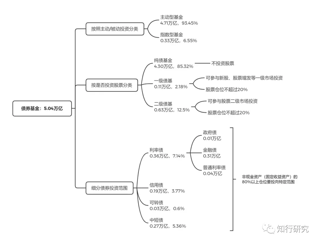 按照主动/被动投资来分,既有被动跟踪某一债券指数的指数型基金,例如「南方1—3年国开债」就是跟踪的「中债1—3年国开行债券指数」,又有依赖基金经理和投研团队的债券管理能力进行主动选股的主动型基金。跟股票类基金类似,目前债券基金中也是主动型基金占据绝对主导地位。