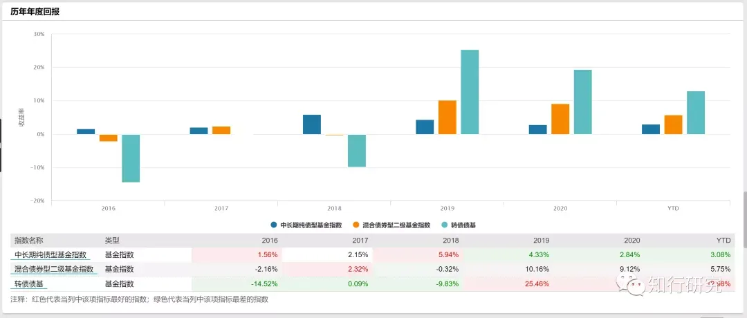 下图是 2016 年到现在,每年的纯债基金、二级债基、转债债基指数的收益情况,也能看出,转债基金的波动也更大一些。
