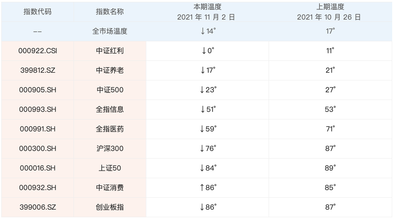 市场回调,带来全市场温度的下降,最新温度是 14°。具体指数温度方面,跟上期相比,除了中证消费,其余都出现了下降。中证红利温度下来得很快,我们下面会详细介绍。除此之外,中证养老和中证500仍然处于中低估区间。