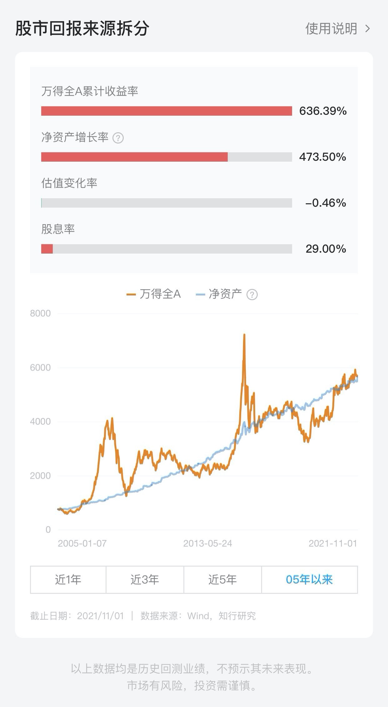 下面这张图是我们的 App 里,我最喜欢的一张图。它用历史数据很好地展示了股市回报来源于什么。