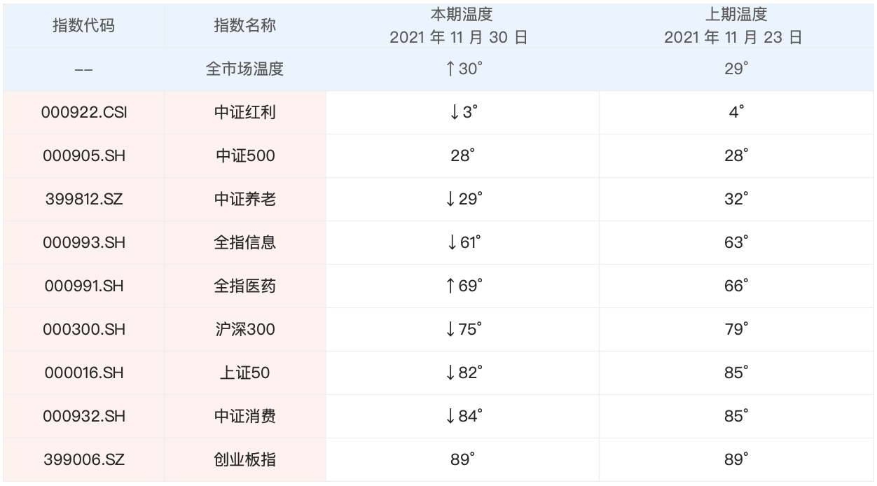 具体指数方面,除了全指医药温度上涨以外,其余大部分指数温度都出现小幅下滑。目前中证红利中证500中证养老的温度还较低。
