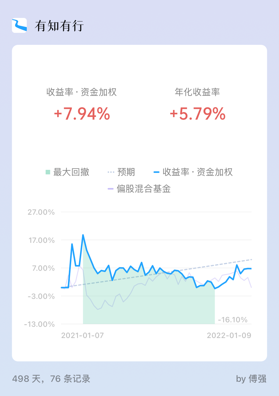2021 年总的投资成绩很一般,年初时候我的总市值曾经达到历史新高,但是后期几个白马股的大幅回撤和股票持仓太重,导致最高时候估计回撤有 30%,后期我降低了股票持仓,换成了基金,年末把回撤控制在 -20% 左右。