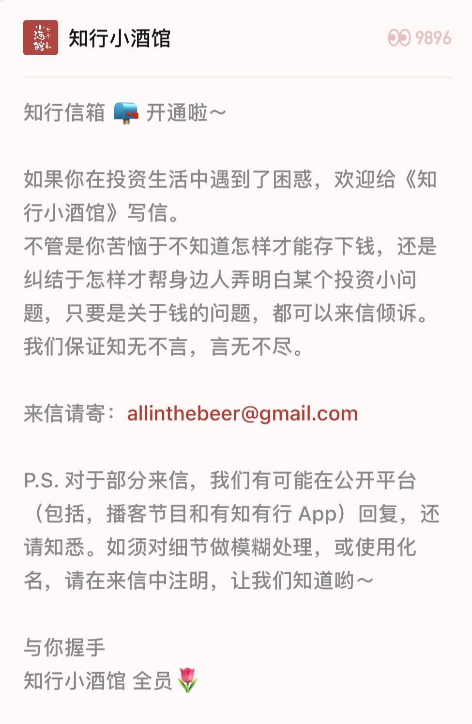 前段时间,知行小酒馆也借用了这个梗。我们刚刚开通的知行信箱,邮箱名字就是 allinthebeer@gmail.com 。说起来,我们已经收到 4 封邮件了,如果你有投资上的困惑,可以向我们投稿诉说,我们也会尽我们所能解答。