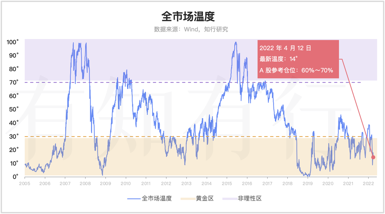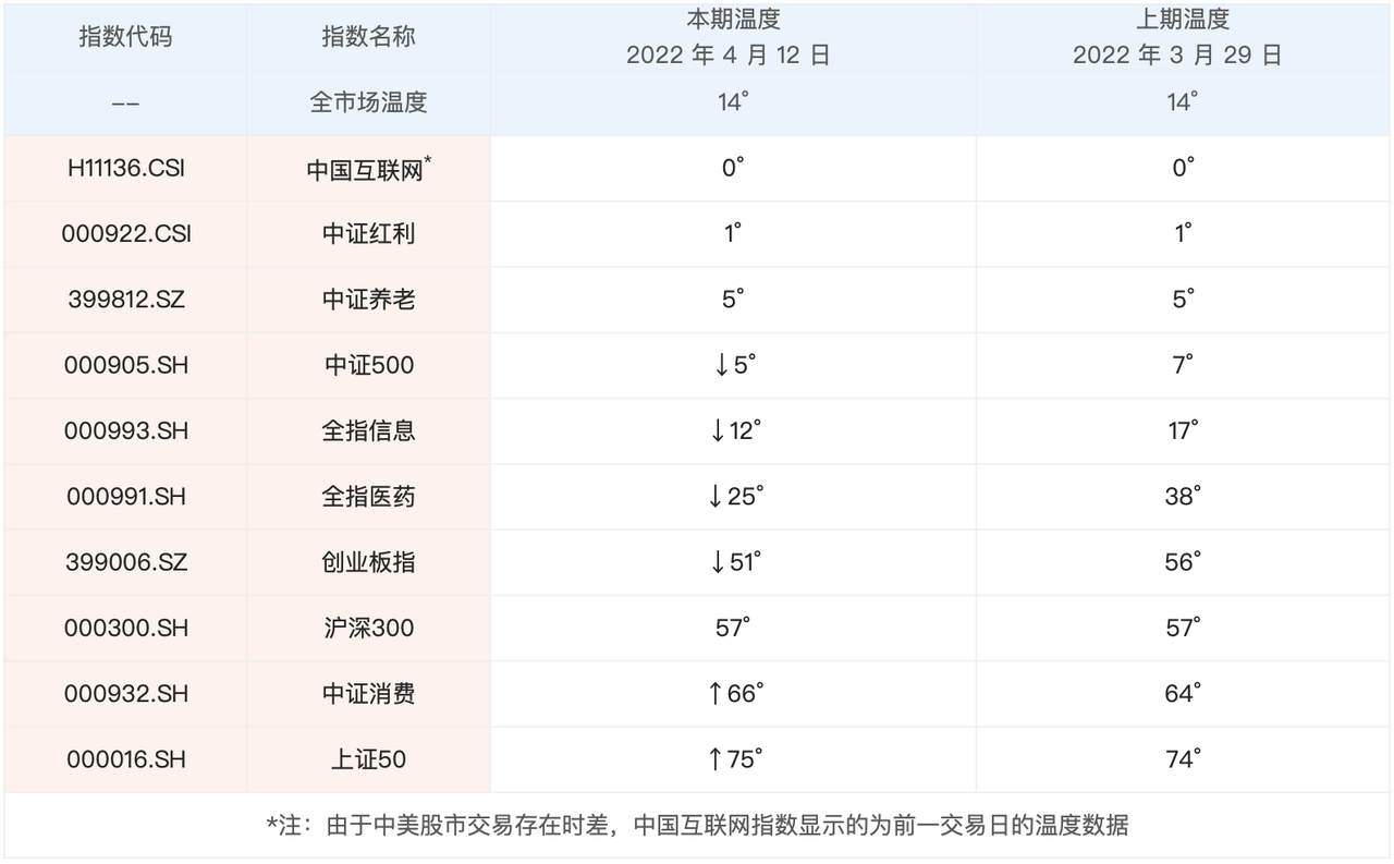 最新的全市场温度有 14°,跟上上周相比,是持平的。具体指数方面,中证500、全指信息、全指医药和创业板指是下跌的。创业板指温度已经到了 50° 附近了,再跌一跌,就可以慢慢布局了。
