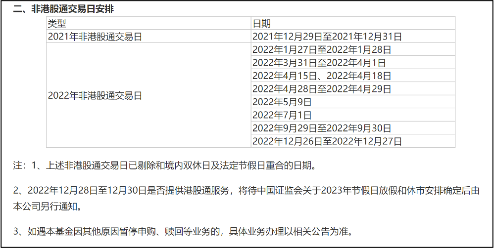 4 月 15 日和 4 月 18 日是香港节假日,港交所不进行交易,所以「天弘恒生科技指数A」也就不能进行申购了。下面的表格是今年这只基金除了境内双休日和法定节假日之外,还需要暂停申购的日子。