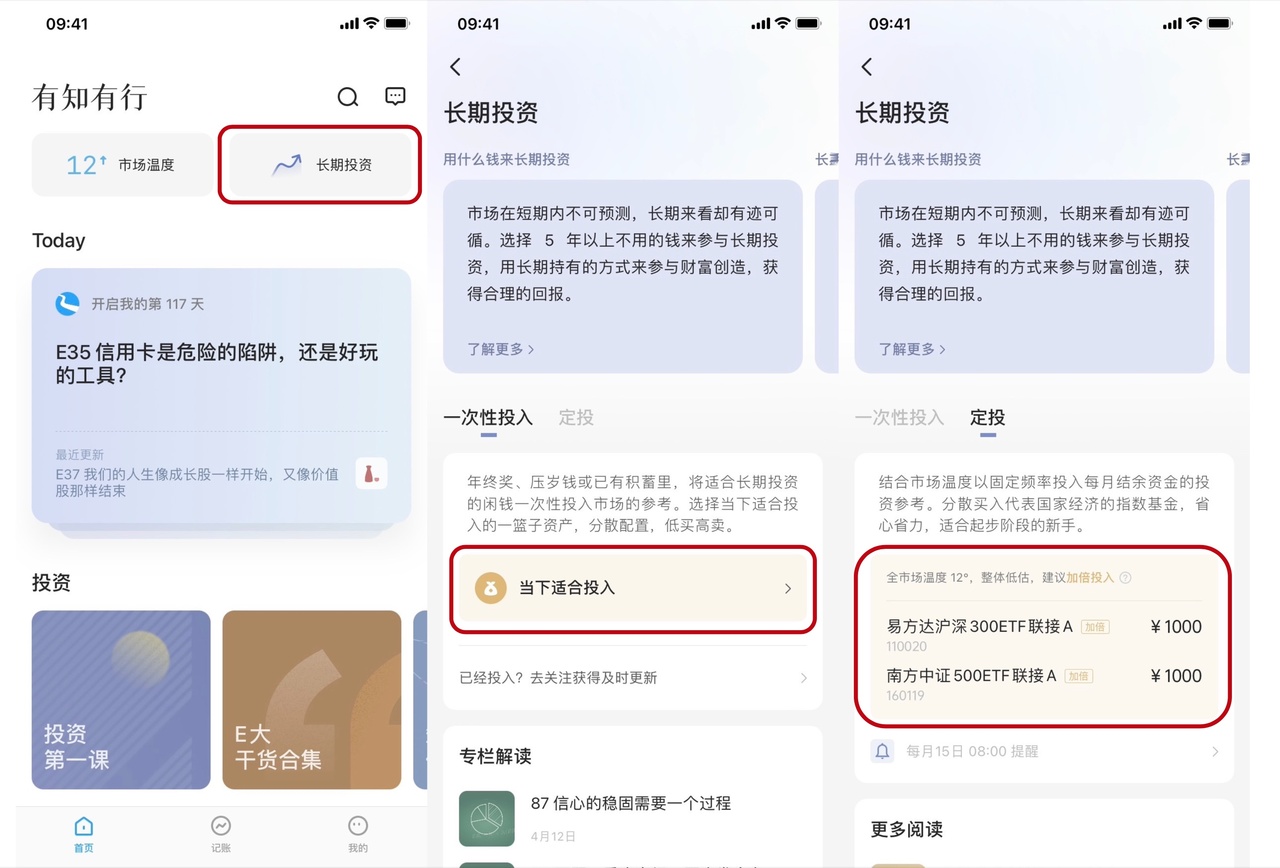 最突出的改变是首页的「黑板报」变成了「长期投资」,将我们 App 里的两个长期投资方式,一个是一次性投入的黑板报,一个是用每月结余资金投资的定投,都放在了「长期投资」的页面,方便大家统一查看。