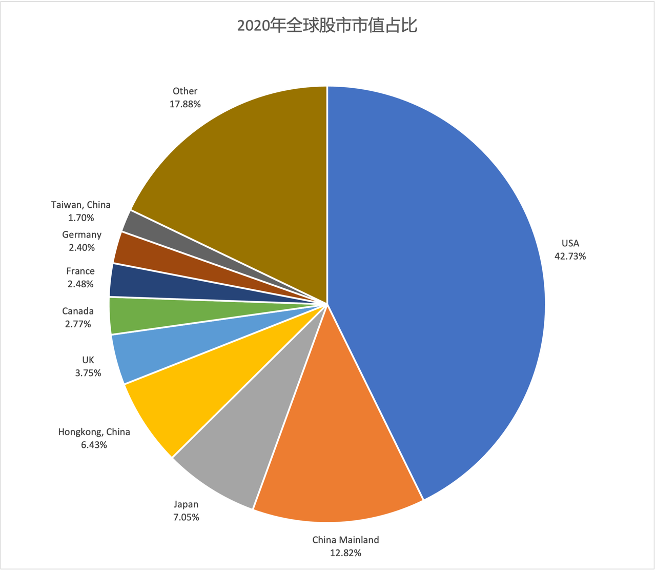 世界银行截止 2020 年的统计数据显示,全球股市市值占比里美国超过 40%,位居第一,中国(中国大陆 + 香港 + 台湾)占比超过 20%,位居第二,其他地区总共占比不到 40%。