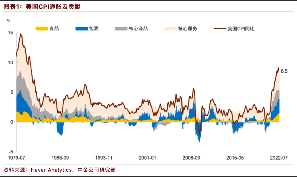 鲍威尔表示,单月的通胀数据改善还远远不够,未来美联储会坚定加息,以确保通胀能回落到 2%。下图显示了美国历史的通胀数据走势,能明显看出来,美国 7 月 CPI 同比 8.5% 的数据离美联储设定的目标还相差很远。这意味着,加息周期还会持续。