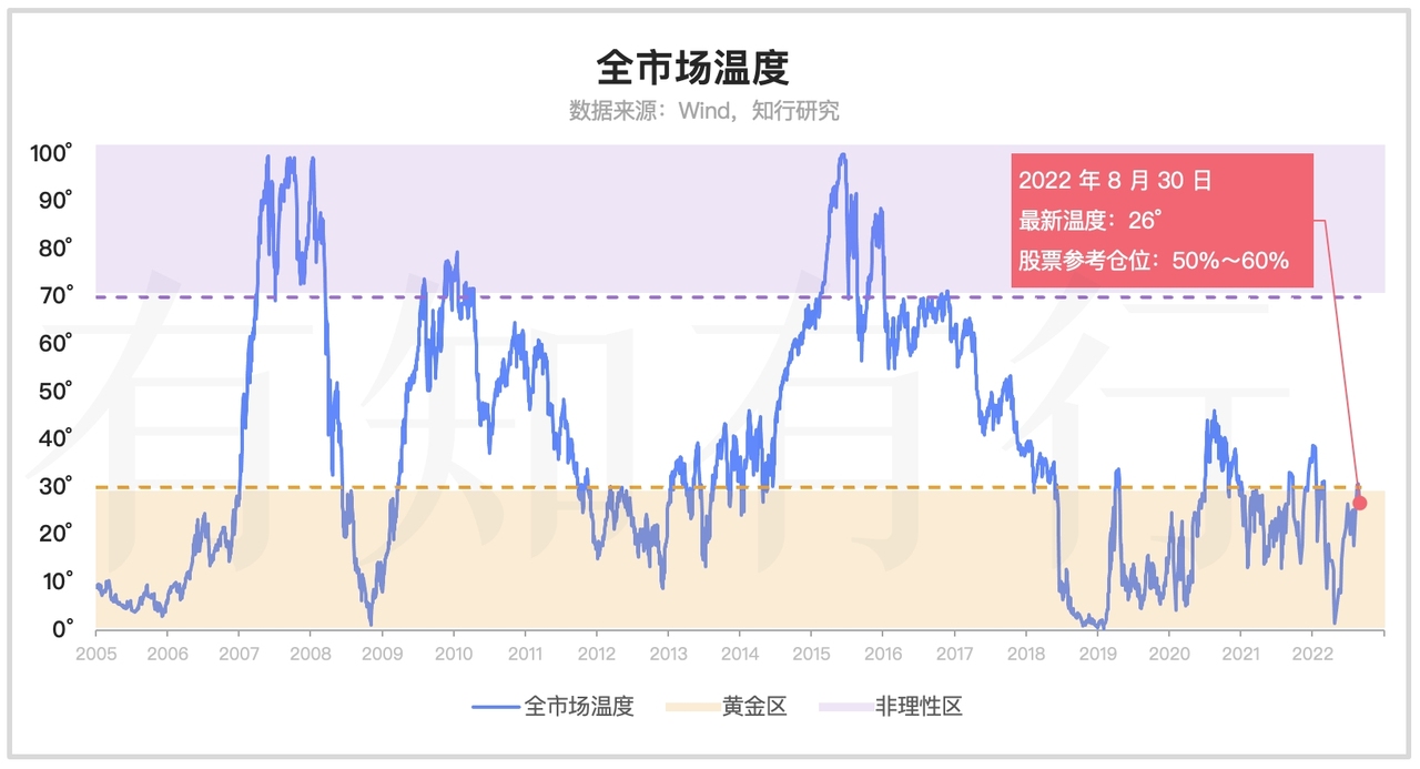 从图里能明显看出来,截止到现在,等权和加权计算的全市场温度都处于低估区域,意味着A股整体处于熊市,大部分个股的估值都很低,A股投资具有性价比。