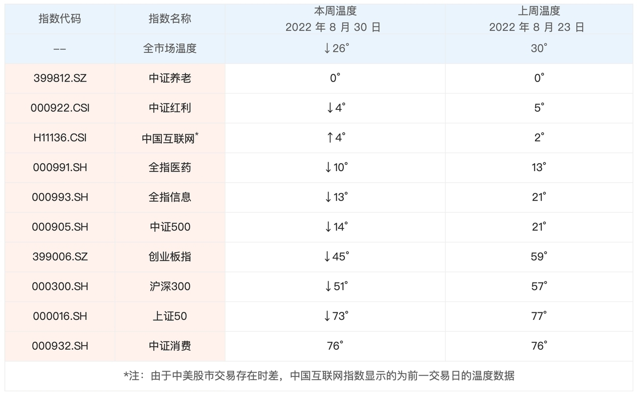 由于大多数个股出现下跌,我们的全市场温度降到了 26°。具体指数方面,过去一周中国互联网、恒生科技、中证消费出现了上涨,其他指数都出现了下跌。下跌的指数里,全指信息、创业板指跌得最多,跌幅都在 6% 以上。这两个指数的温度也下降得很快。