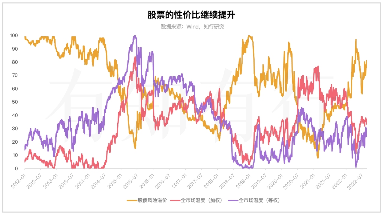 全市场温度(等权)、全市场温度(加权)显示了目前股票市场在历史中处于什么样的位置,温度越低,说明股票的性价比越高。我们在 App 里显示的是等权视角,图里面加入了加权视角的数据。等权意味着全市场的个股对全市场温度的影响是一样的,加权意味着大盘股对全市场温度的影响更大。