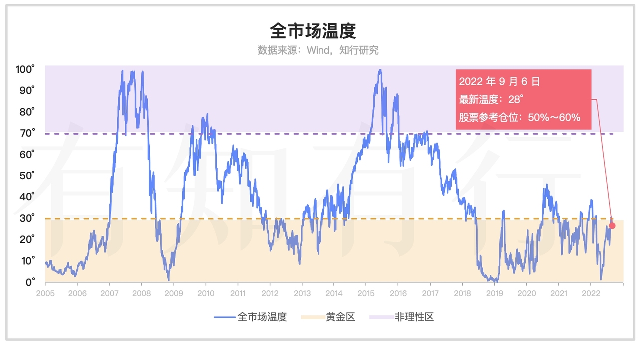 在这个过程中,宽基指数之间、行业之间、个股之间的分化很大。全市场里面,中小盘股的整体表现好于大盘股,这使得我们的全市场温度跟上周相比,出现了上升,最新温度达到 28° 。