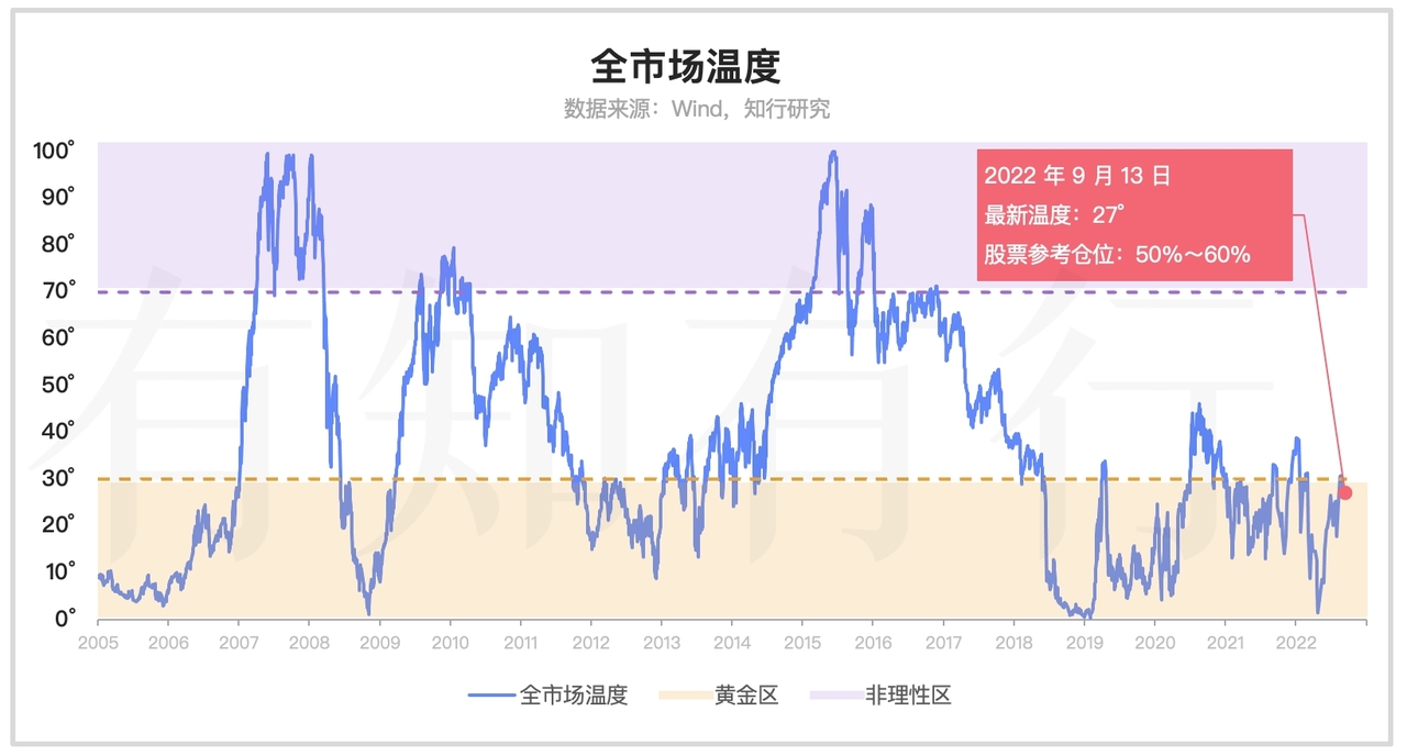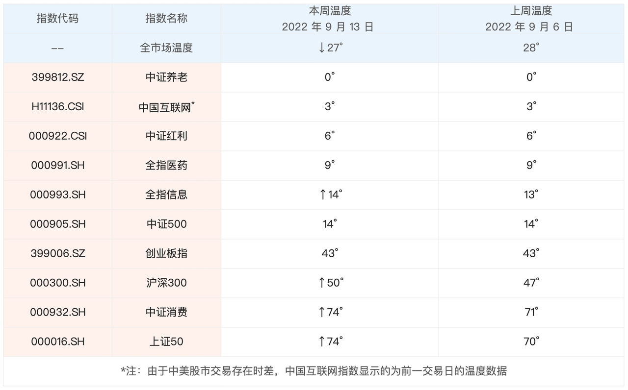 经过一周的涨跌,最新的全市场温度是 27°,具体指数的温度跟上周比,也变化不大。结合全市场温度和具体指数的温度情况,本周长钱账户的配置资产没有调整。
