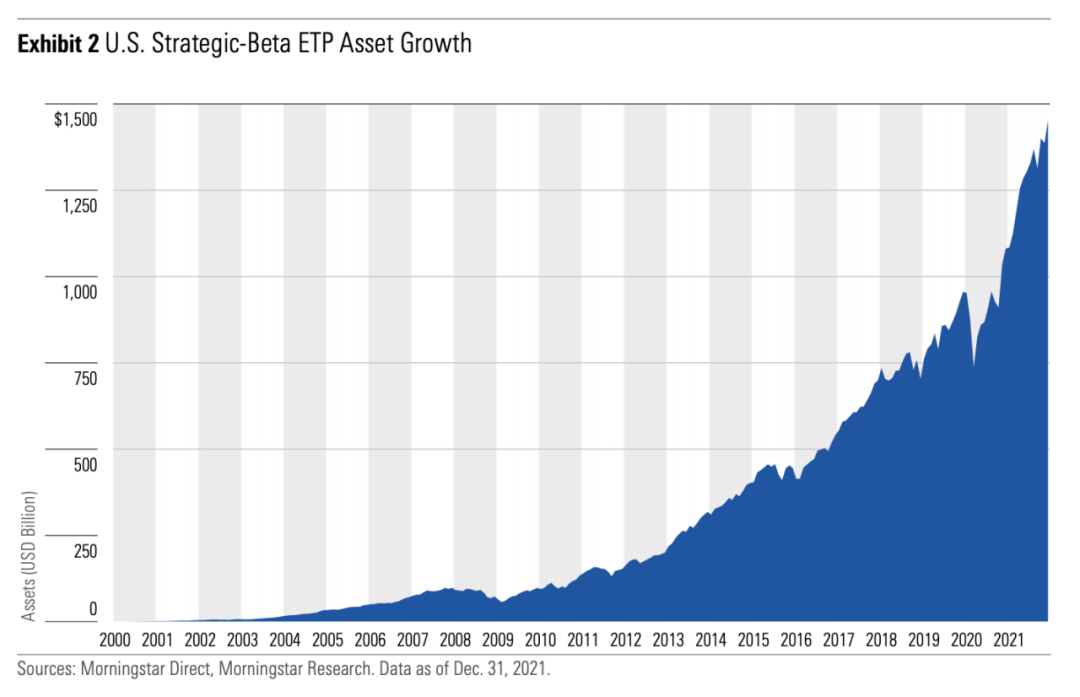 从 2000 年开始,Smart Beta 策略 ETP(Exchange Traded Products)从无到有,不断发展长大,发展速度超过了整体的 ETP 市场。截止 2021 年底,美国 Smart Beta 策略 ETP 达到 622 只,1.45 万亿美元规模,占据了 20% 左右的 ETP 市场。