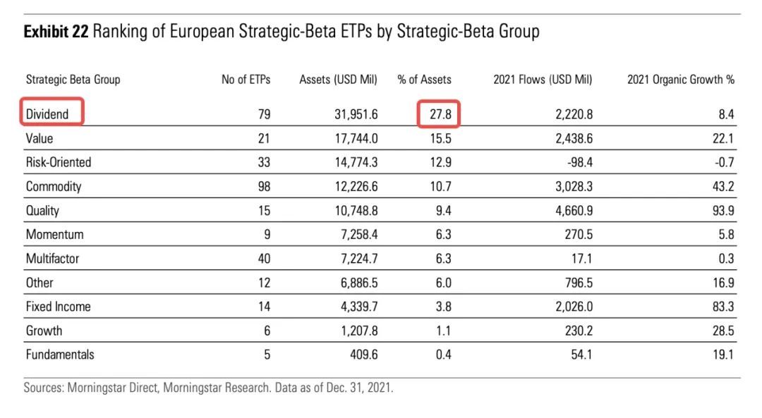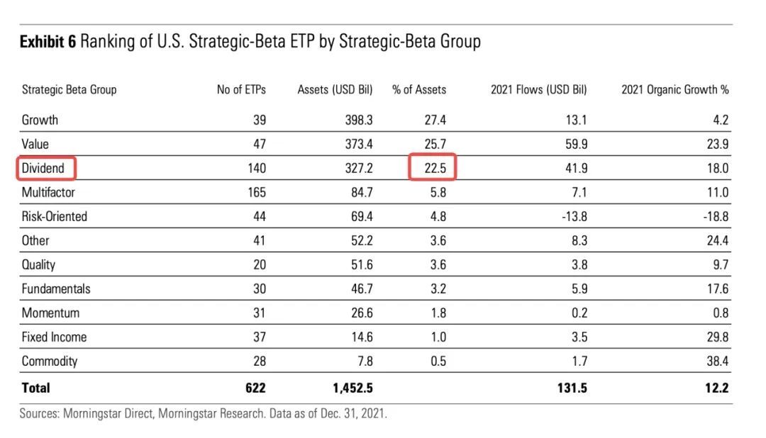 3⃣️ 截至 2021 年底,美国红利策略管理的 ETP 总资产占所有 Strategic-Beta 策略的 22.5%,位于第三位,说明红利策略受到了成熟市场的青睐。