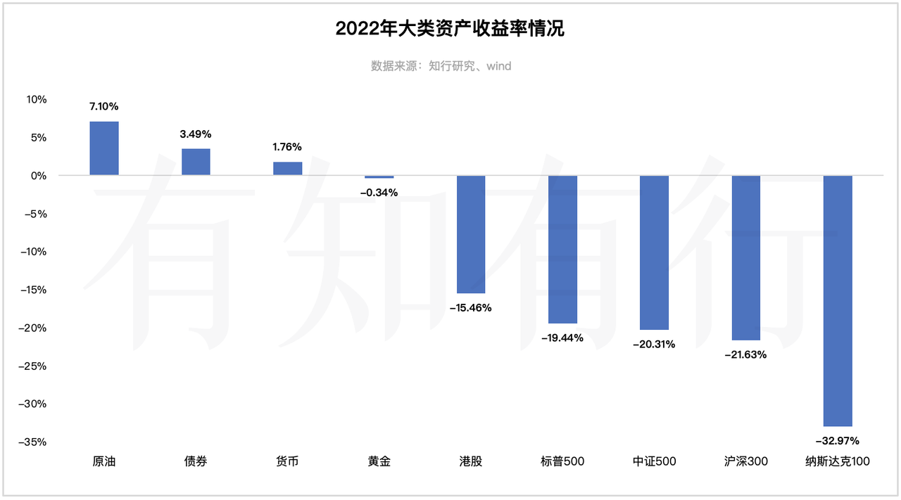 在这个过程中,大部分国家的大部分资产的表现都让人遗憾。这里面表现最好的原油指数涨了 7.10%。过去一年原油价格的变化算是跌宕起伏,上半年受俄乌冲突等影响,市场担心原油供应不足,于是油价大幅上涨后在高位震荡;下半年市场对全球经济衰退的担忧加剧,于是油价也相应回落。从这种走势来看,全年想在原油上面赚到钱,难度系数会很大。