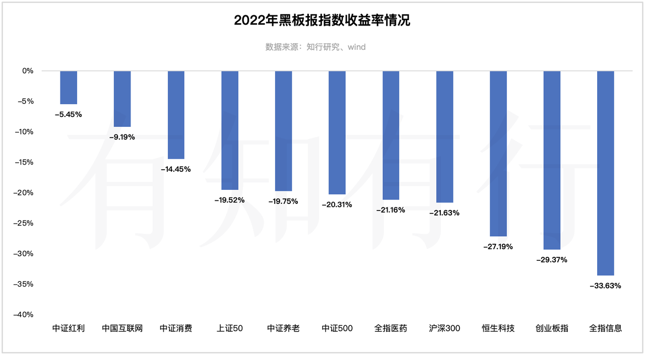 去年A股的表现介于港股和美股之间,沪深300和中证500指数全年分别下跌 21.63% 和 20.31%。下图是黑板报关注的指数去年的收益率情况。2022 年的A股市场笼罩在不确定性的阴霾中,总体表现不佳。中证红利相对比较抗跌,全年共下跌 5.45%。前两年表现较好的创业板指今年回落较大,全年共下跌 29.37%。