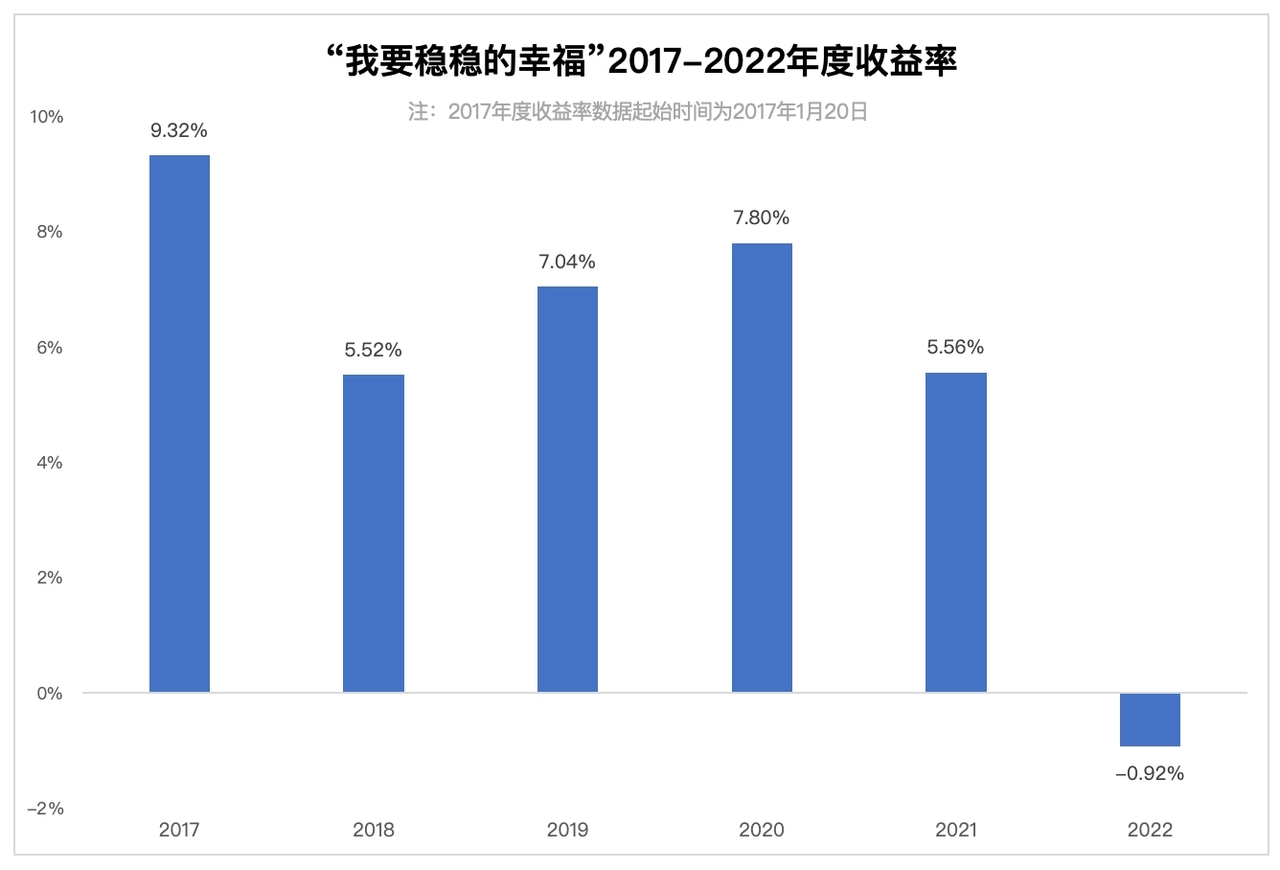 股市下跌,债市表现差强人意,「固收+」这种产品今年很受伤。下图是「我要稳稳的幸福」2017 年到现在的年度表现,很明显能看出来,2022 年股债双杀的局面,导致这类产品获得了年度最差表现。