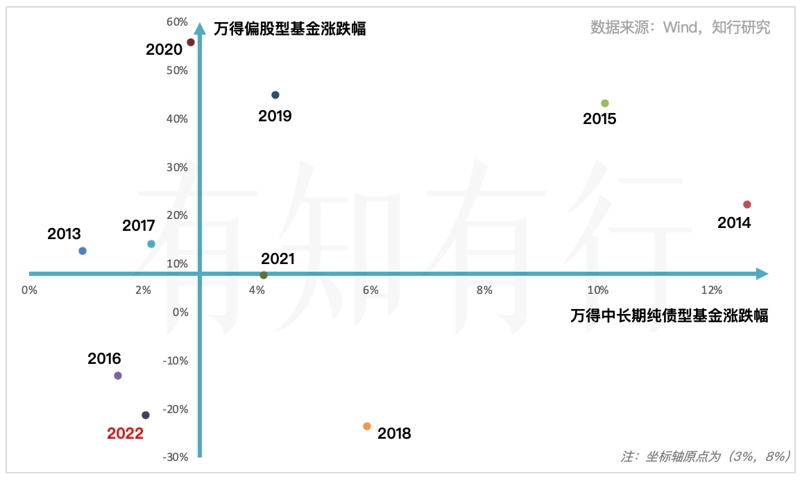 我们把这两类资产每年的情况画在四个象限里,能看出来很多信息。我们能看出 2022 年属于过去十年里股债双杀的年份,在这个象限里,还有 2016 年。然而就投资体验来说,2022 年比 2016 年还要糟糕。