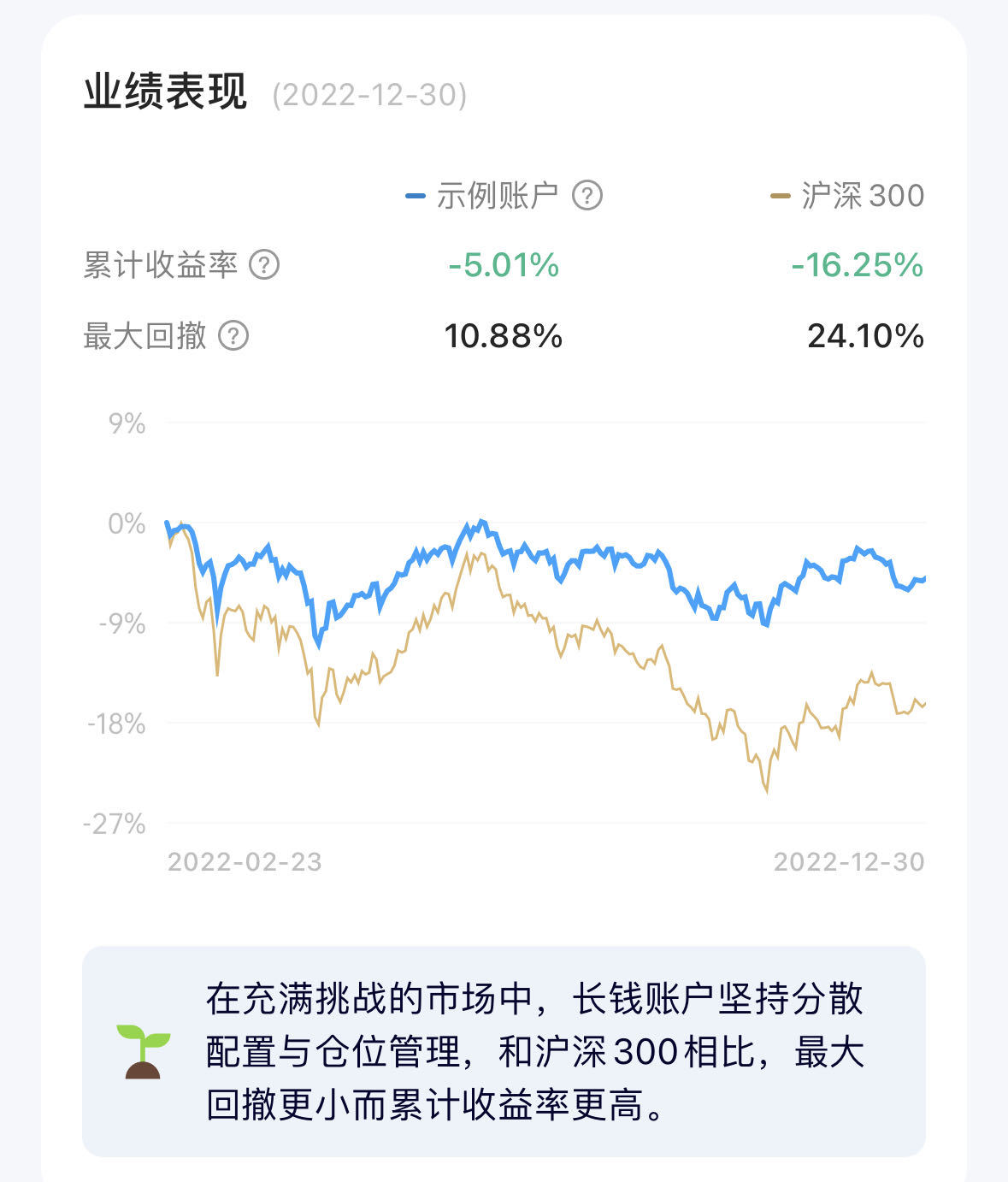 长钱账户推出还不到一年,每个人买入长钱账户的时间也不一样,为了让大家了解长钱账户的操作,长钱账户展示了 2022 年 2 月 23 日买入的一个示例账户的业绩表现(上图)。那时候正处于股市下跌过程中,买入并持有到 2022 年年底,该账户浮亏 5.01%,同期沪深300跌了 16.25%,跟市场指数相比,亏损幅度很小。从最大回撤的指标能看出,长钱账户的风险控制得也很好。