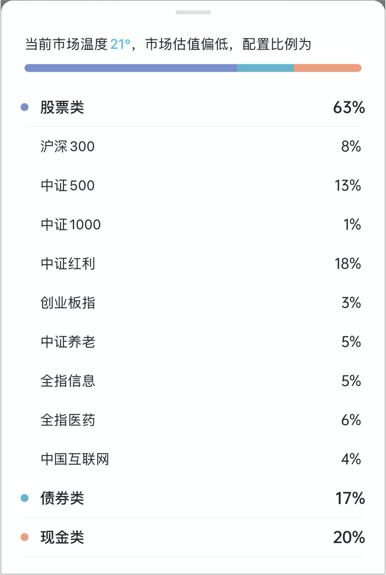 我们看看如果你现在有一笔钱买入长钱账户,会让你如何分配股票类、债券类、现金类资产的比例呢?下面这张图展示得很清晰。如果你现在买入,股票类资产的比例是 63%,这个比例并不算太高,跟当下的市场情况是匹配的。再来看股票类里的具体品种,尽管最近涨了,但它们都还处于中低估的区间,是具有性价比的,是可以进行配置的。