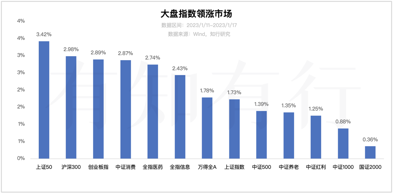 原因在于,最近的市场反弹里,大盘股的反弹力度会更强,大多数中小盘股整体也上涨了,但涨幅相对来说则小得多。下面这张图里显示了最近一周A股市场里代表性指数的涨跌情况。上证50、沪深300是大盘股的代表性指数,最近一周分别上涨了 3.42% 和 2.98%,国证2000和中证1000则是中小盘股的代表性指数,只涨了 0.36% 和 0.88%。