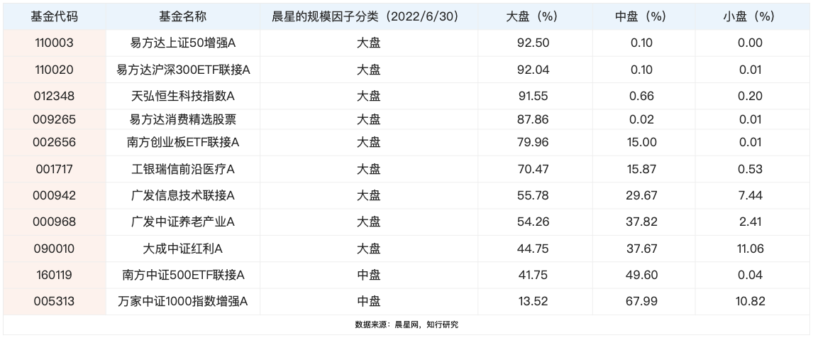 再进一步,我们能从指数编制方式上,很容易地知道上证50、沪深300是大盘股指数,国证2000、中证1000是中小盘指数,中证500则介于它们之间,因为这些指数本身就是按照股票的市值规模大小进行挑选的。但是,我们怎么知道其他品种或者基金在大盘股、中盘股、小盘股上面的配置情况呢?