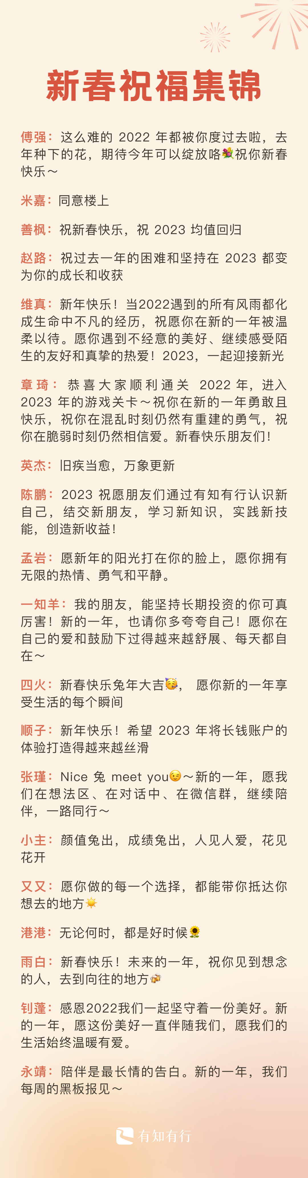 最后,文末彩蛋来了,值此新春佳节来临之际,送上有知有行同学们给大家的新春祝福,请查收。我们春节后见。