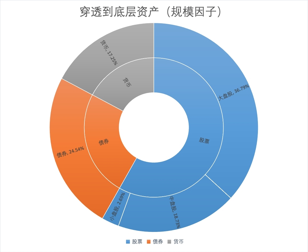如果把长钱账户配置的基金按照上面的分类结果进行一下穿透、汇总,可以得到长钱账户在大盘、中盘、小盘上面的配置情况,我们来看看,现在买入长钱账户,是如何进行分配的?