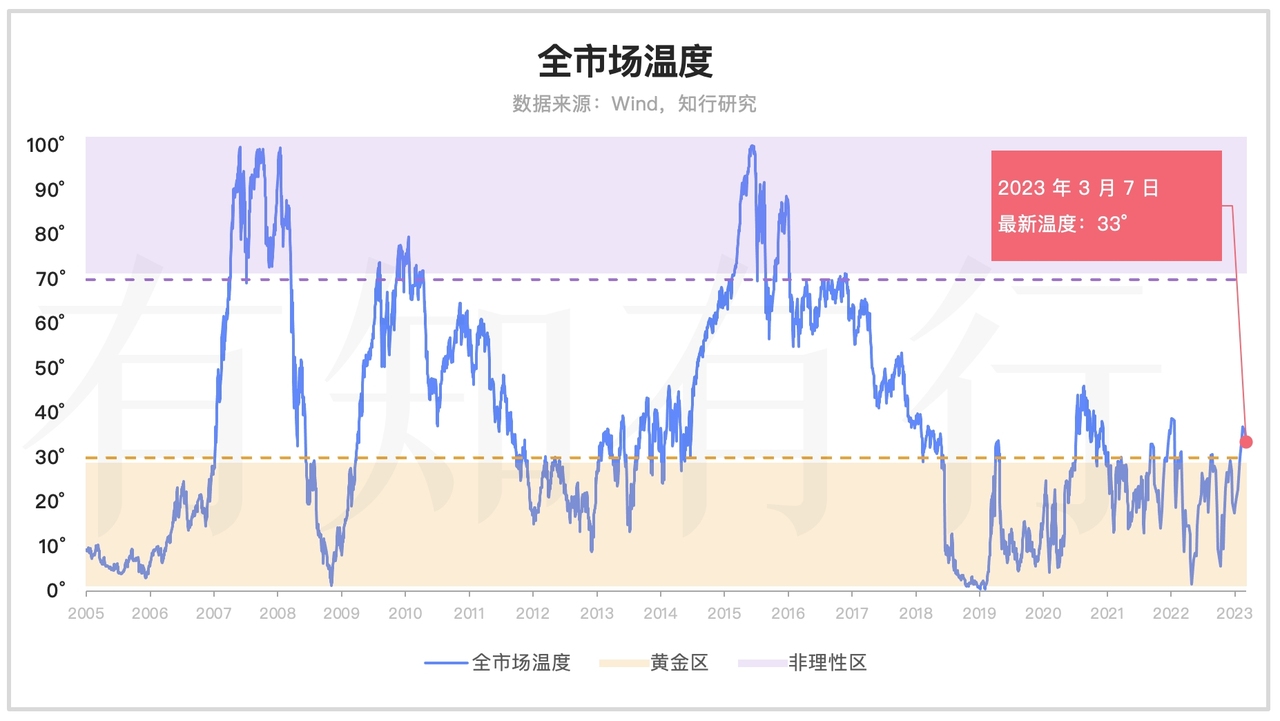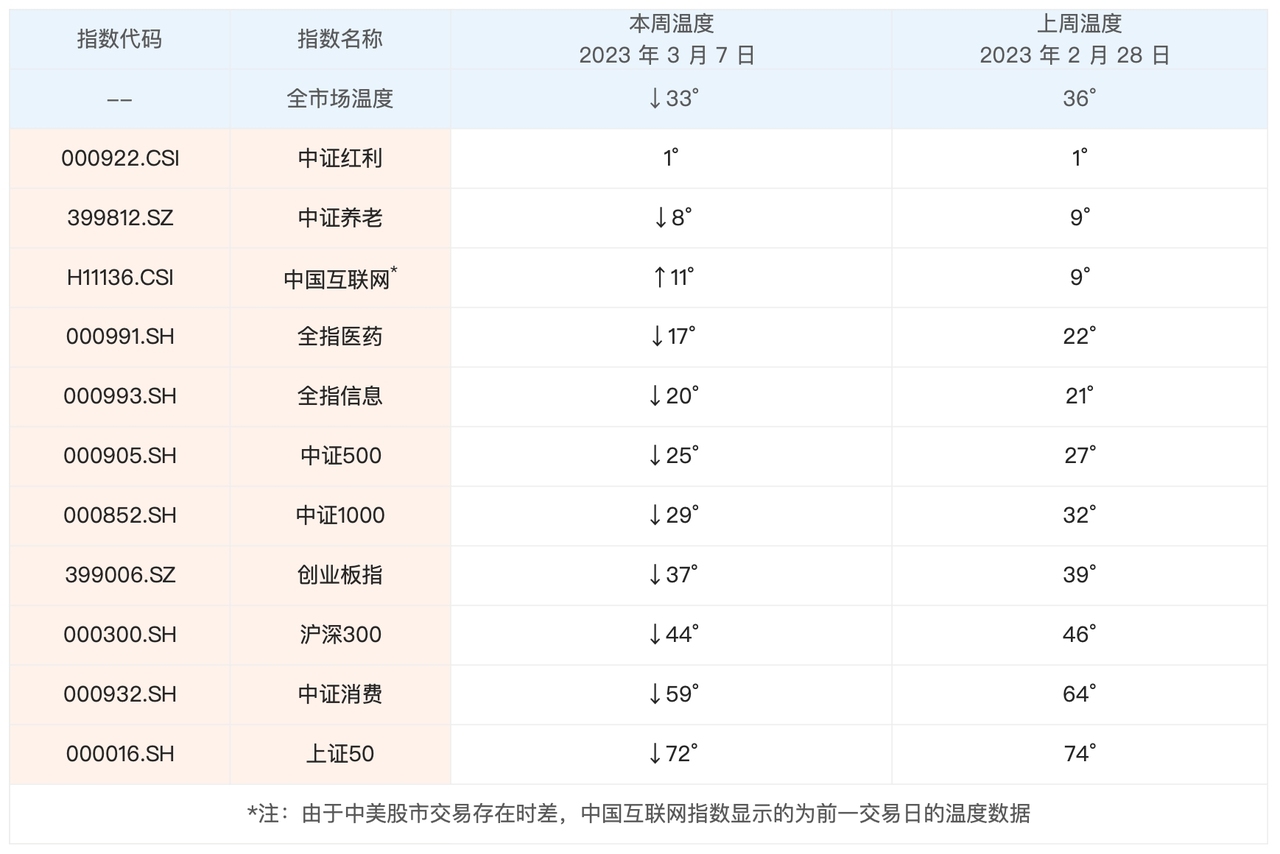 由于本周A股市场的回调,最新的全市场温度跌到了 33°。具体指数方面,A股指数里面,除了中证红利是小幅上涨之外,其它指数都是下跌的,其中全指医药、中证消费跌幅较大,最近一周跌了 2% 以上,温度下来得比较快。作为中概股的中国互联网和恒生科技,最近一周出现反弹,因此温度出现了上涨。总体来说,市场的震荡导致全市场温度和具体指数温度也很纠结,涨涨跌跌没有明显的变化。